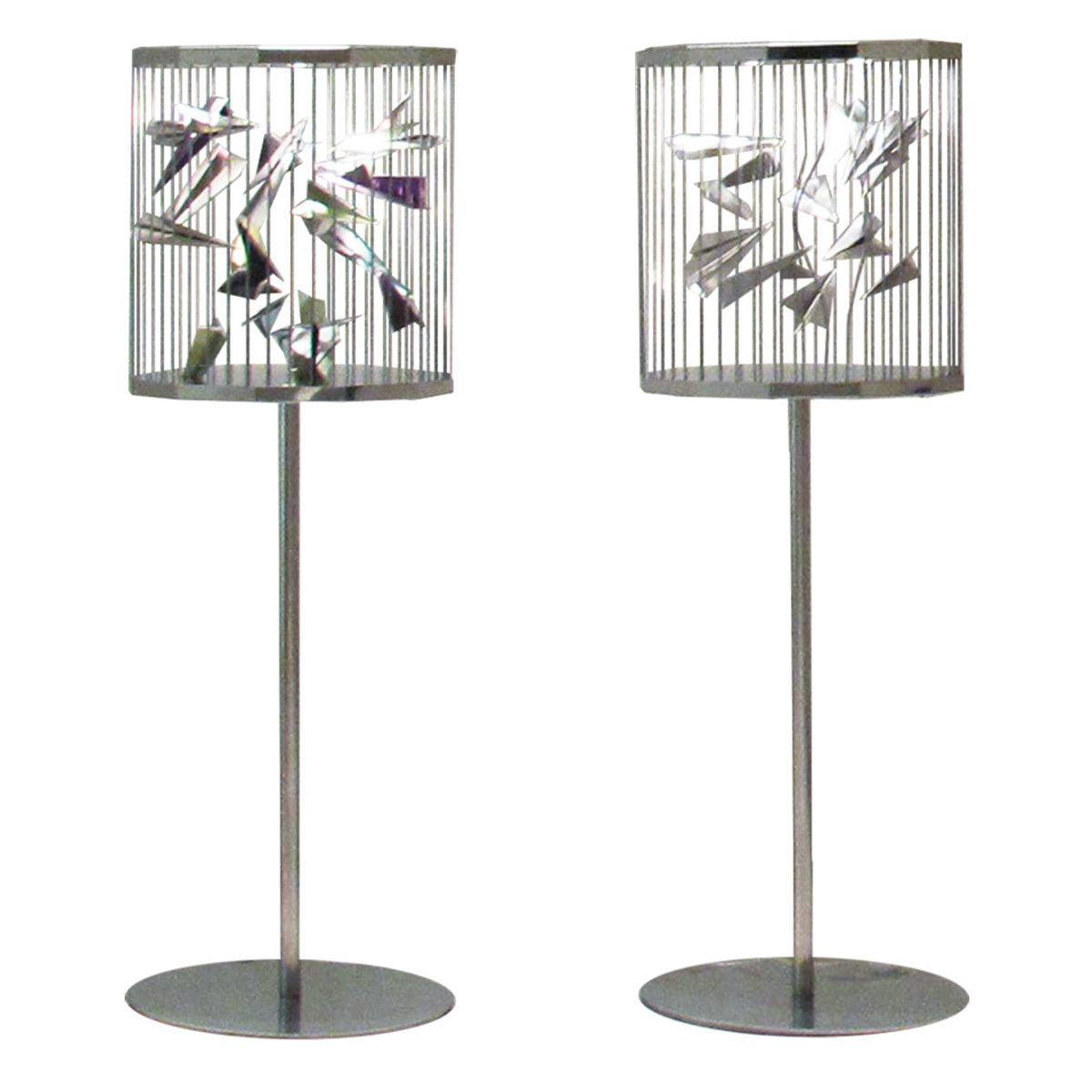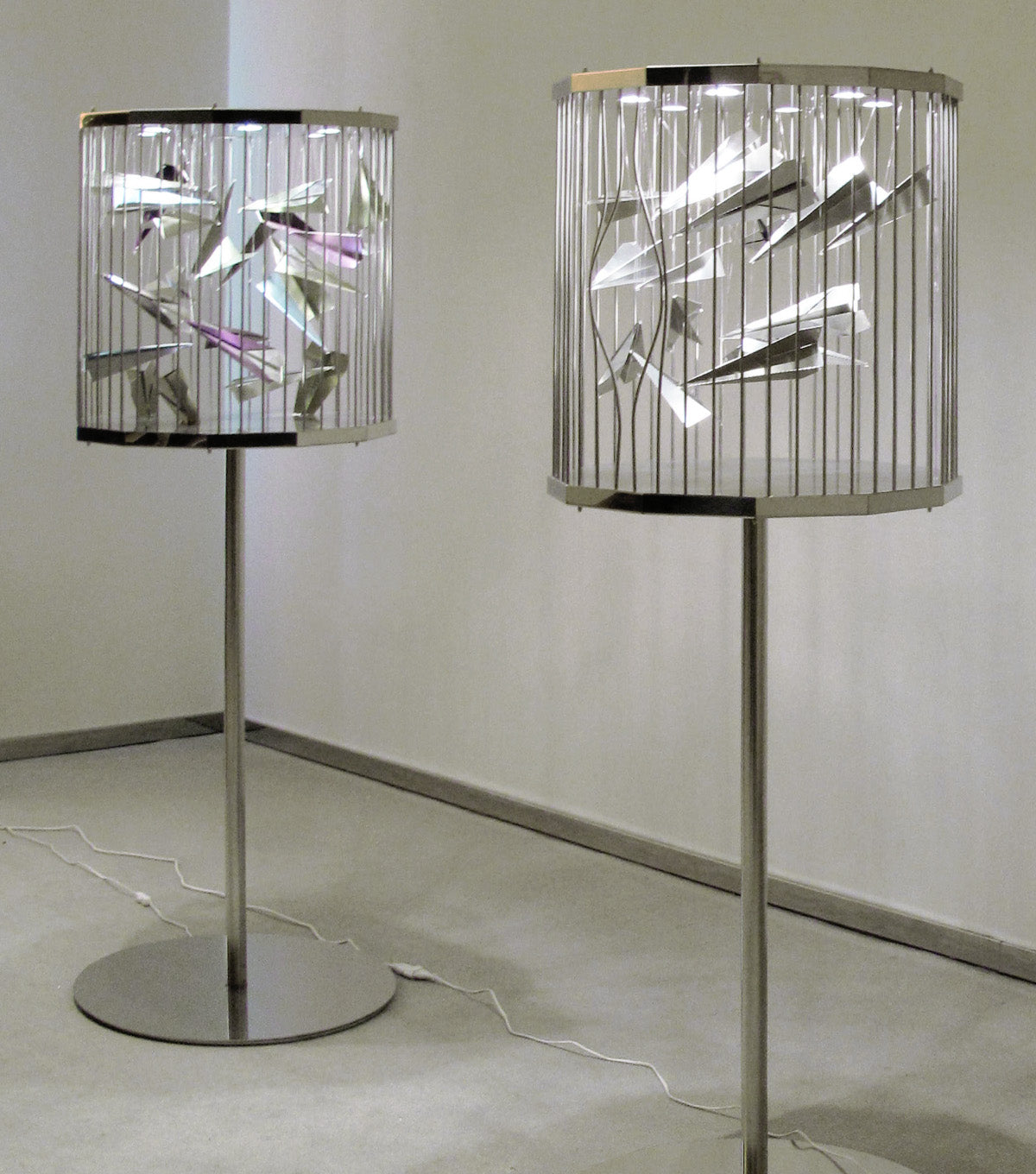 Luminous sculpture with six light points and fifteen steel airplanes in A5 format, contained in a structure (also completely made of steel). Like birds in a cage, the airplanes (which in this version are all with a metallic finish) are obviously looking for a way out. Noticing some torn bars, most of them head towards the exit to gain the longed-for freedom.