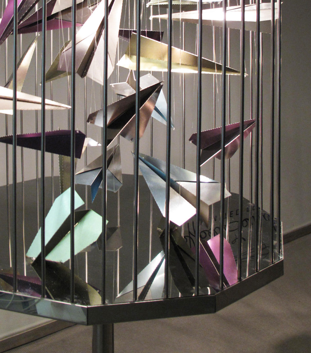 Luminous sculpture with six light points and twenty-four steel airplanes in A5 format, contained in a structure (also completely made of steel). Like budgies in a cage, the airplanes (which in this version are all in assorted metallic colors) try to survive in the limited space available. In the struggle for survival, some have fallen to the ground, sinking into the metal.