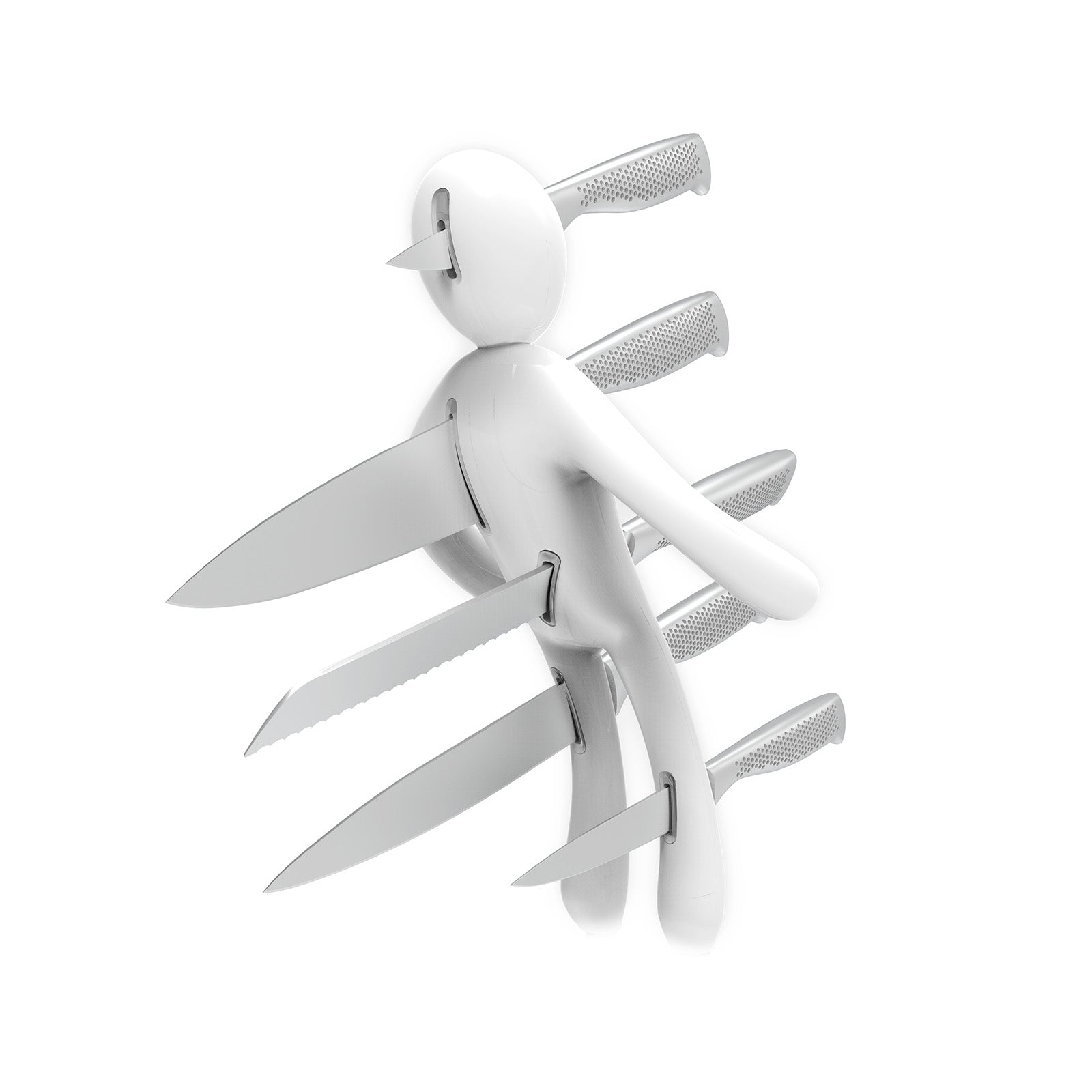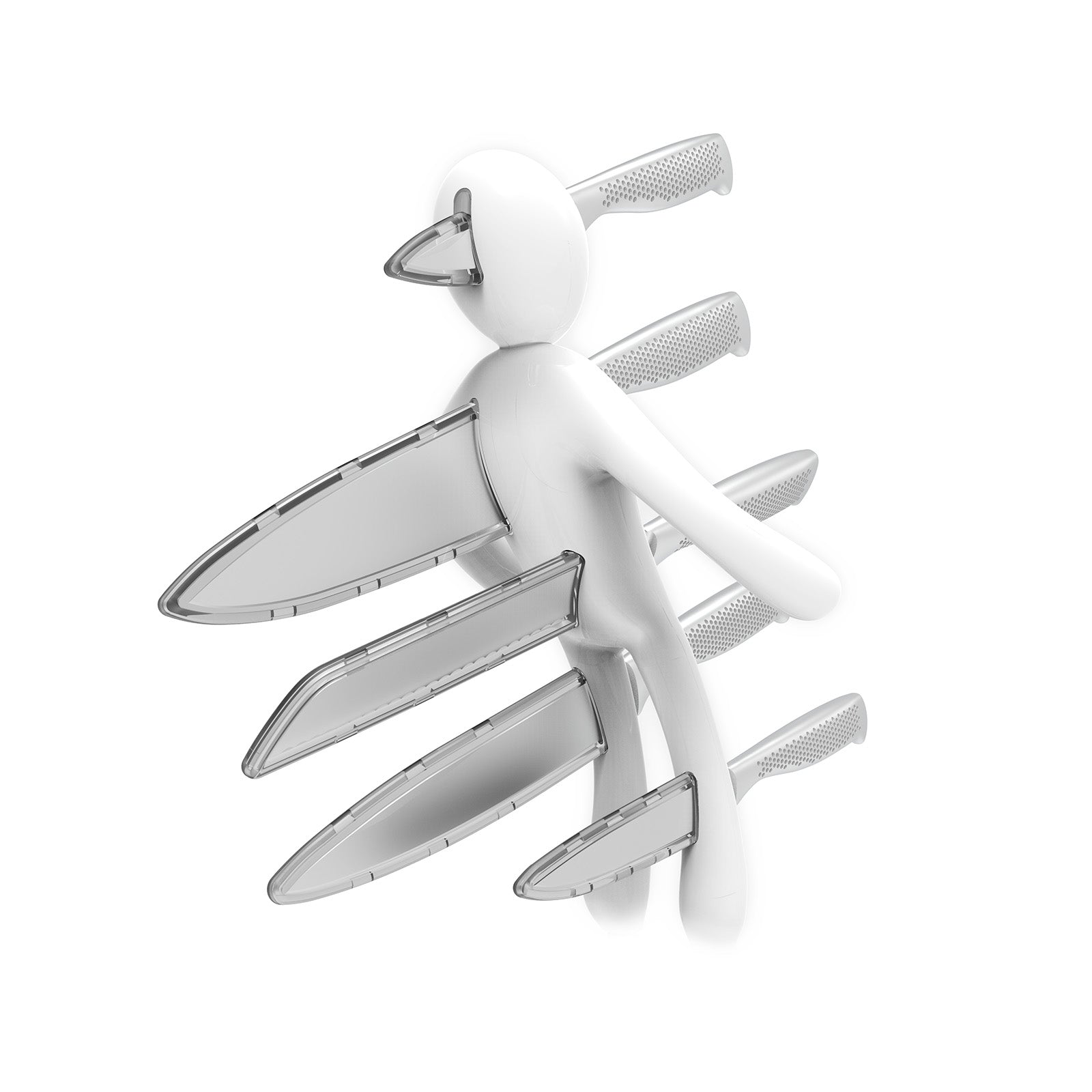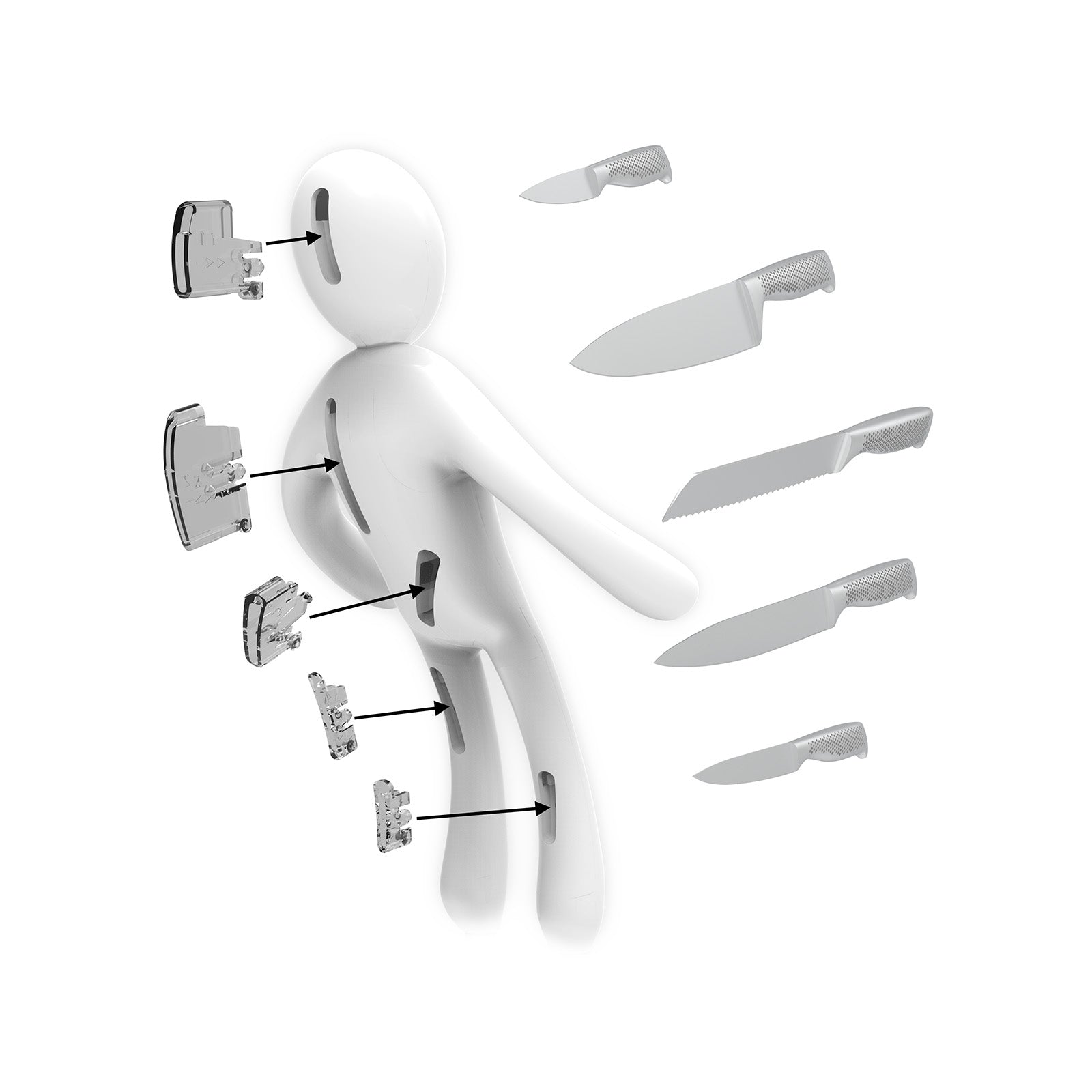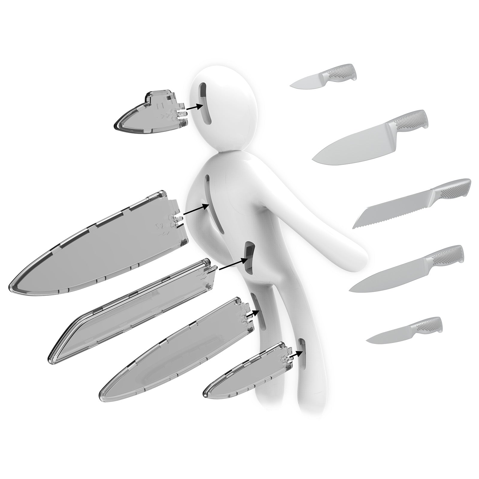 You can easily switch from one version to another by mounting the right accessory in the back holes of the holder shaped like a stylized human figure. If you want to have the blades visible, you need to remove the sheaths and fit the covers for the holes, which allow the knives to slide and remain in position once they have been fully inserted. If, on the other hand, you want to protect the blades from any accidental contact, you need to remove the hole covers and fit the blade covers. The Voodoo/TheEx knife set cannot be used if one of the two accessories is not fitted, otherwise the knives would not stay in their position once inserted into the holder.