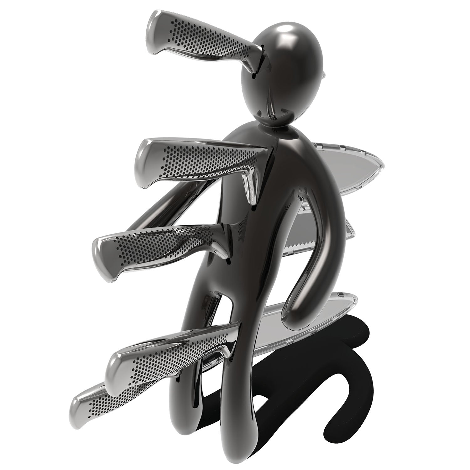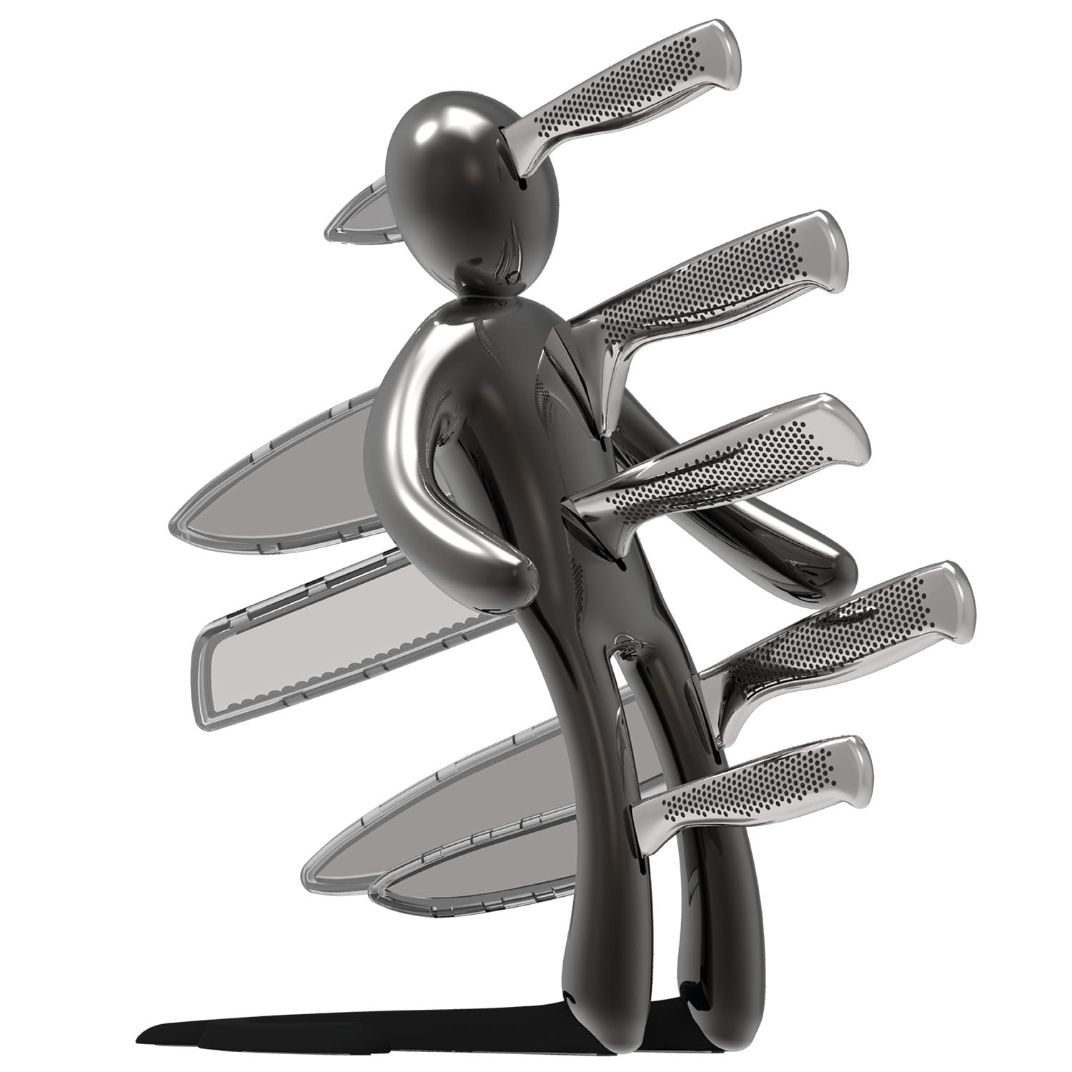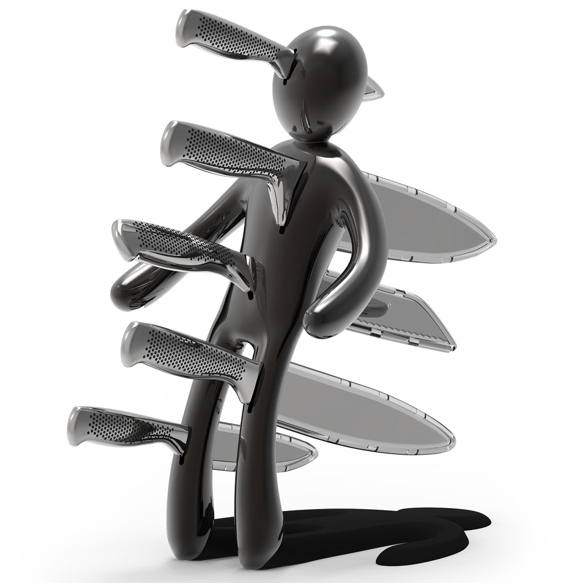 La figura umana stilizzata è colta nell’esatto istante in cui cade all’indietro, trafitta dall’ultima coltellata fatale. I piedi poggiano direttamente sul piano, facendo apparire la figura quasi sospesa a mezz’aria. Realizzato interamente in metallo, il prodotto risulta molto pesante: questo garantisce un’eccellente stabilità e consente l’uso con una sola mano, permettendo di inserire o rimuovere i coltelli senza dover tenere fermo il supporto.