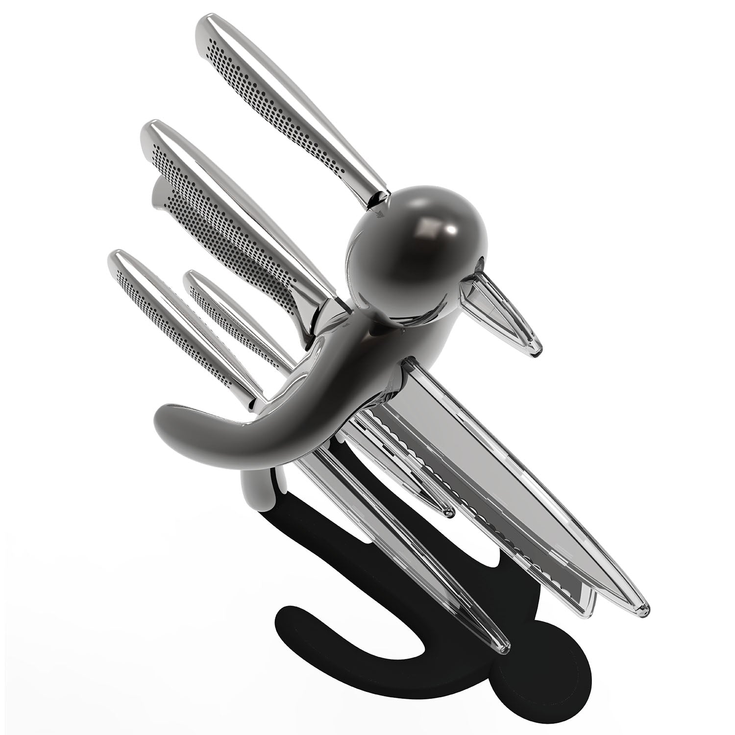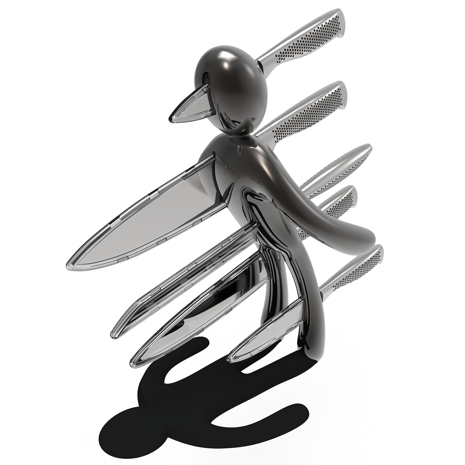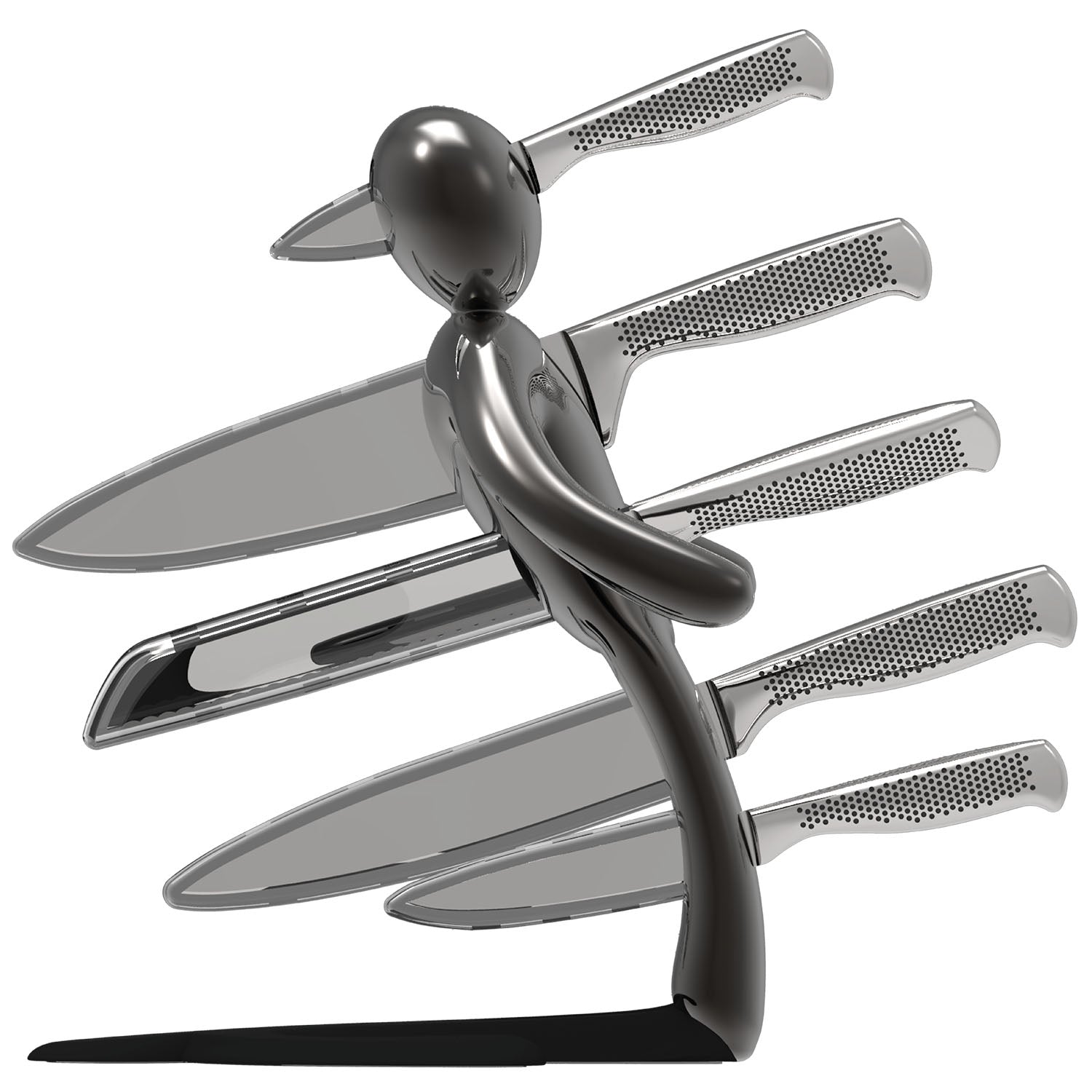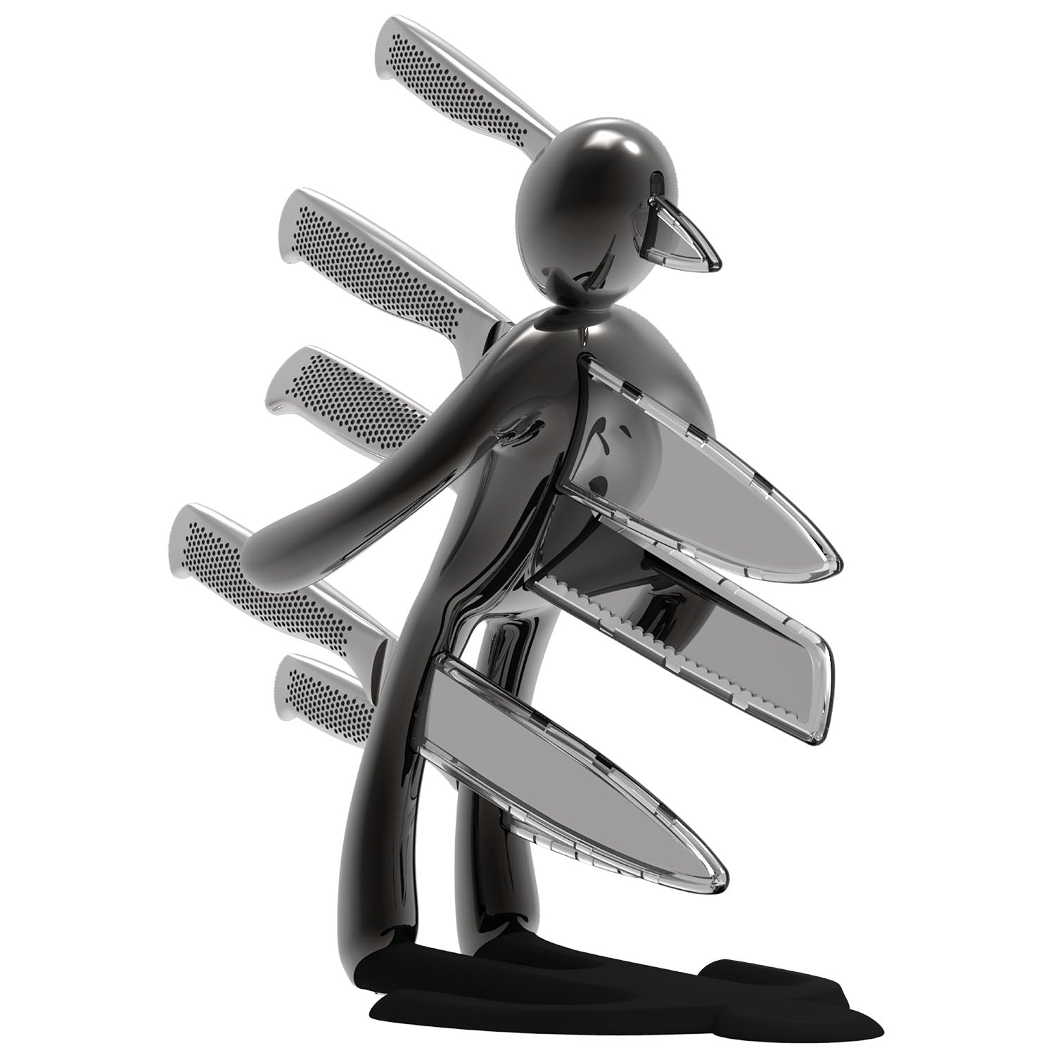 La figura umana stilizzata è colta nell’esatto istante in cui cade all’indietro, trafitta dall’ultima coltellata fatale. I piedi poggiano direttamente sul piano, facendo apparire la figura quasi sospesa a mezz’aria. Realizzato interamente in metallo, il prodotto risulta molto pesante: questo garantisce un’eccellente stabilità e consente l’uso con una sola mano, permettendo di inserire o rimuovere i coltelli senza dover tenere fermo il supporto.