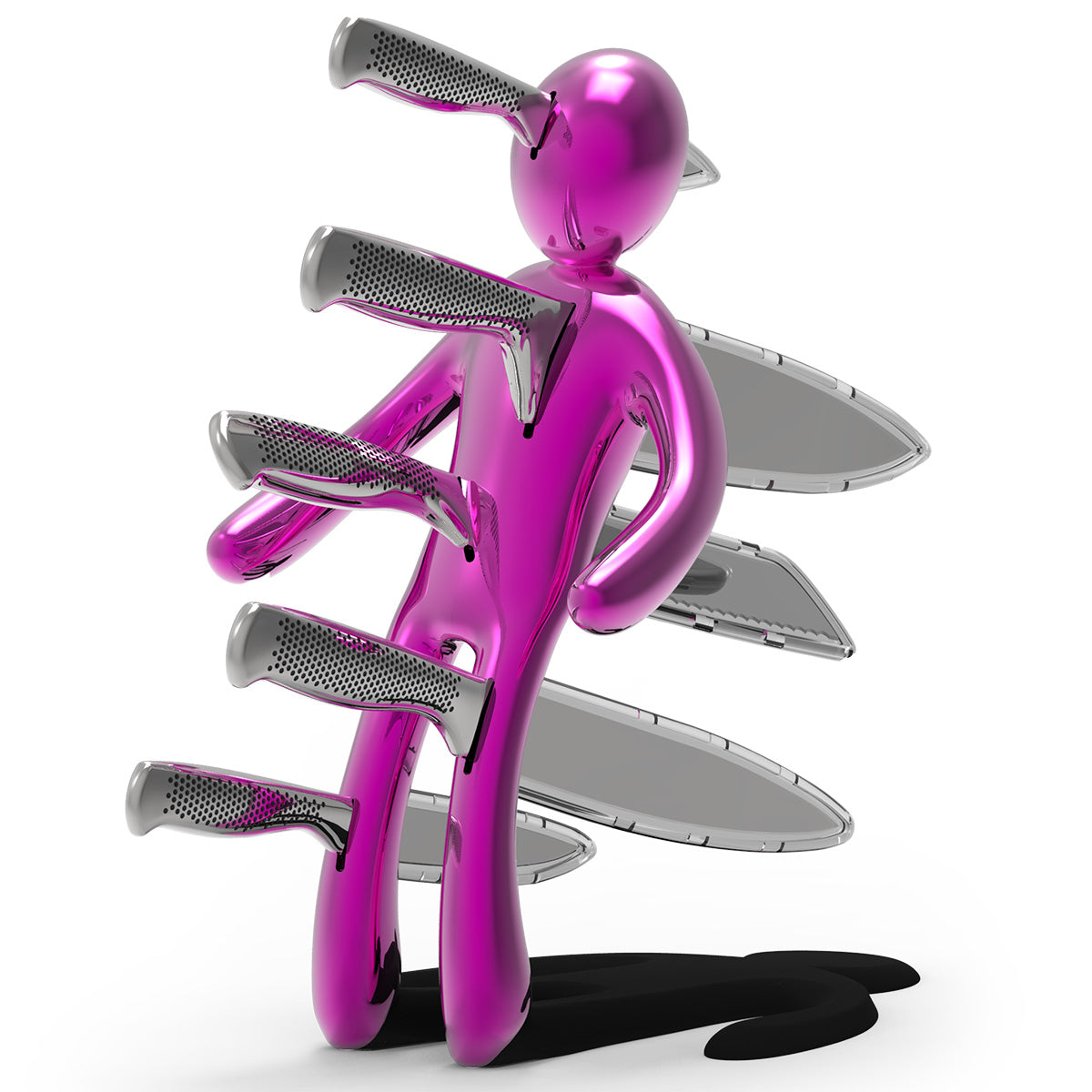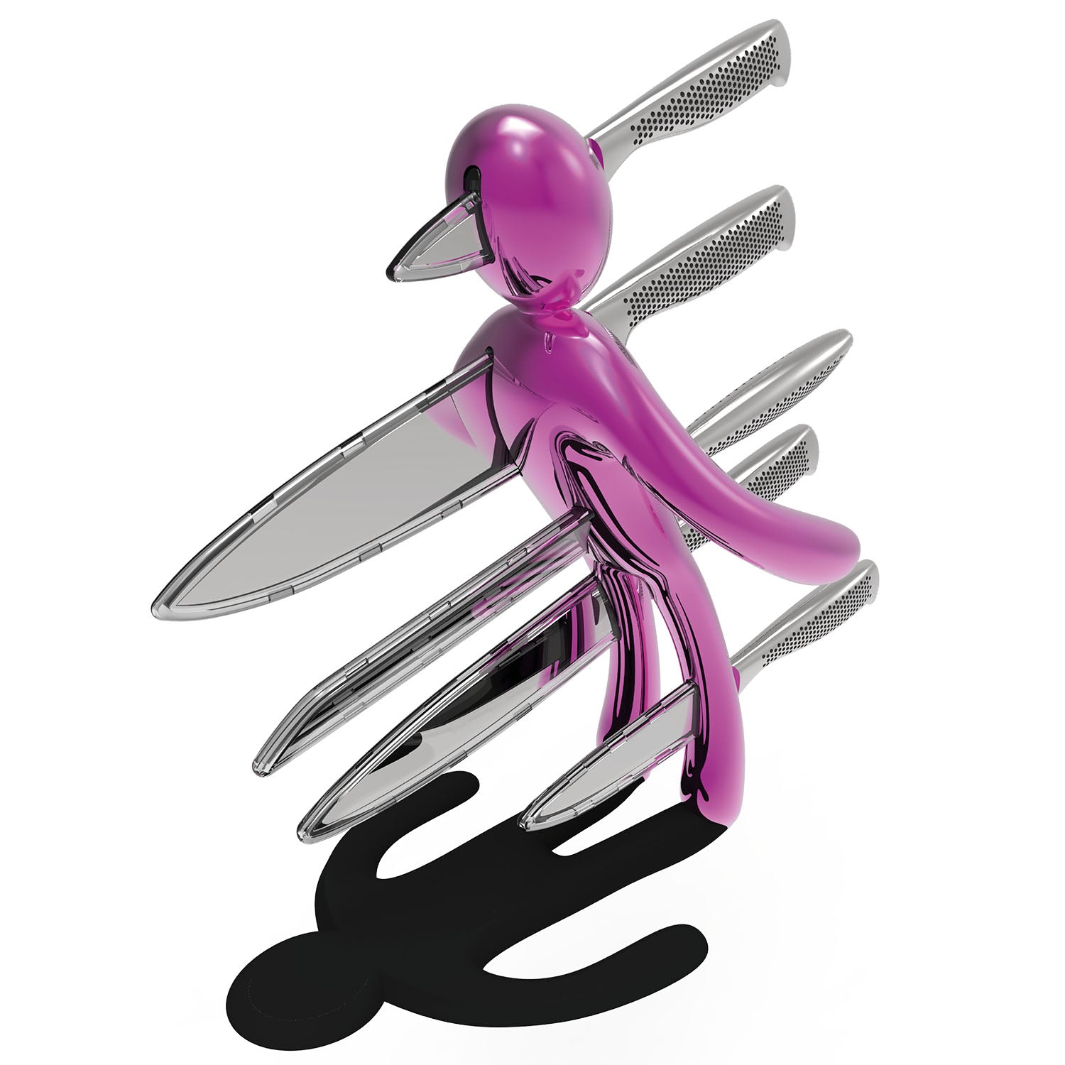 La figura umana stilizzata è colta nell’esatto istante in cui cade all’indietro, trafitta dall’ultima coltellata fatale. I piedi poggiano direttamente sul piano, facendo apparire la figura quasi sospesa a mezz’aria. Realizzato interamente in metallo, il prodotto risulta molto pesante: questo garantisce un’eccellente stabilità e consente l’uso con una sola mano, permettendo di inserire o rimuovere i coltelli senza dover tenere fermo il supporto.