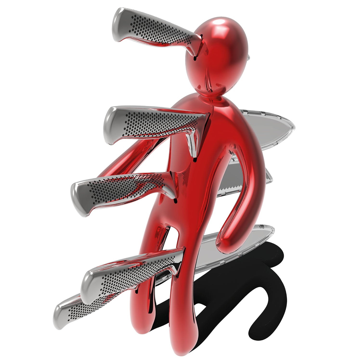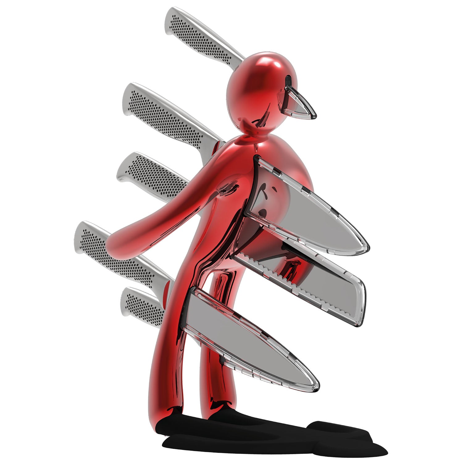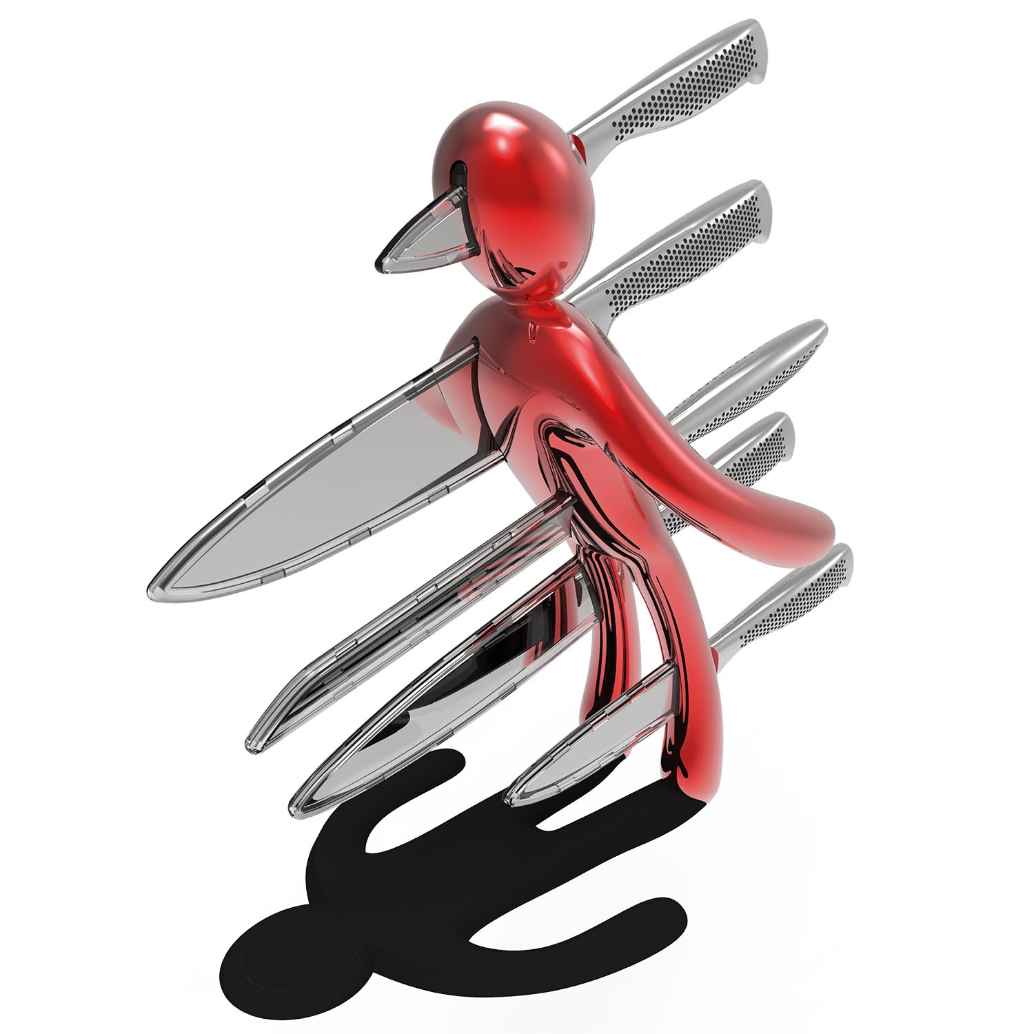 La figura umana stilizzata è colta nell’esatto istante in cui cade all’indietro, trafitta dall’ultima coltellata fatale. I piedi poggiano direttamente sul piano, facendo apparire la figura quasi sospesa a mezz’aria. Realizzato interamente in metallo, il prodotto risulta molto pesante: questo garantisce un’eccellente stabilità e consente l’uso con una sola mano, permettendo di inserire o rimuovere i coltelli senza dover tenere fermo il supporto.