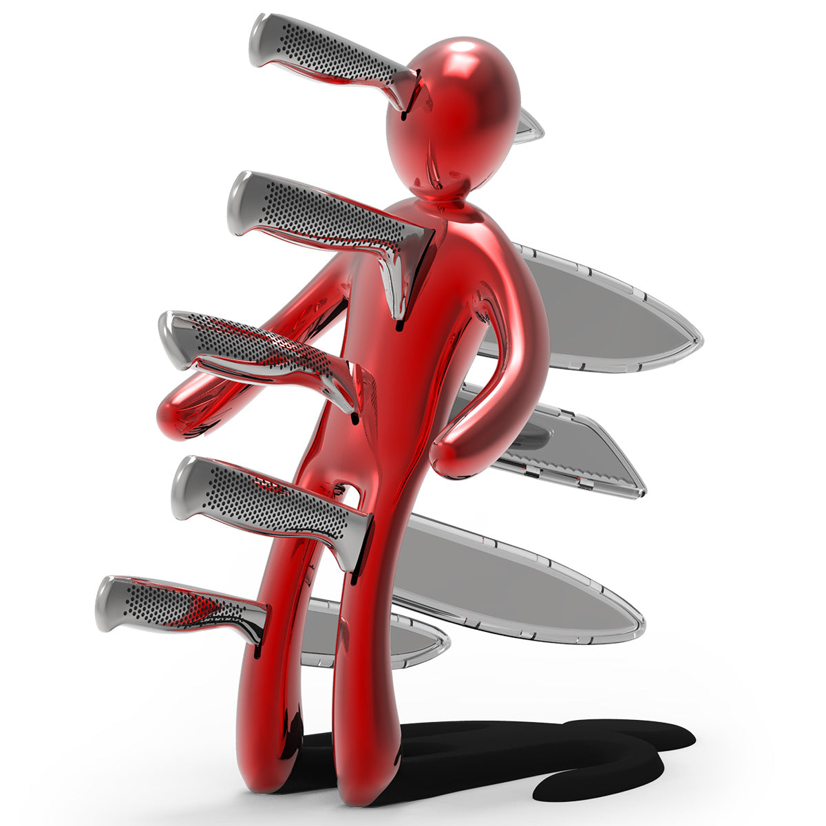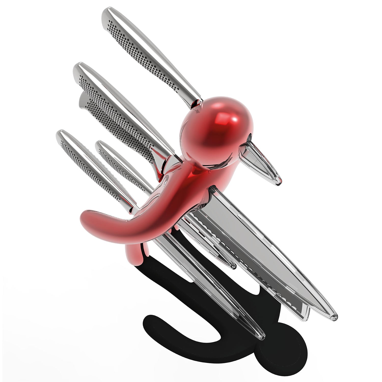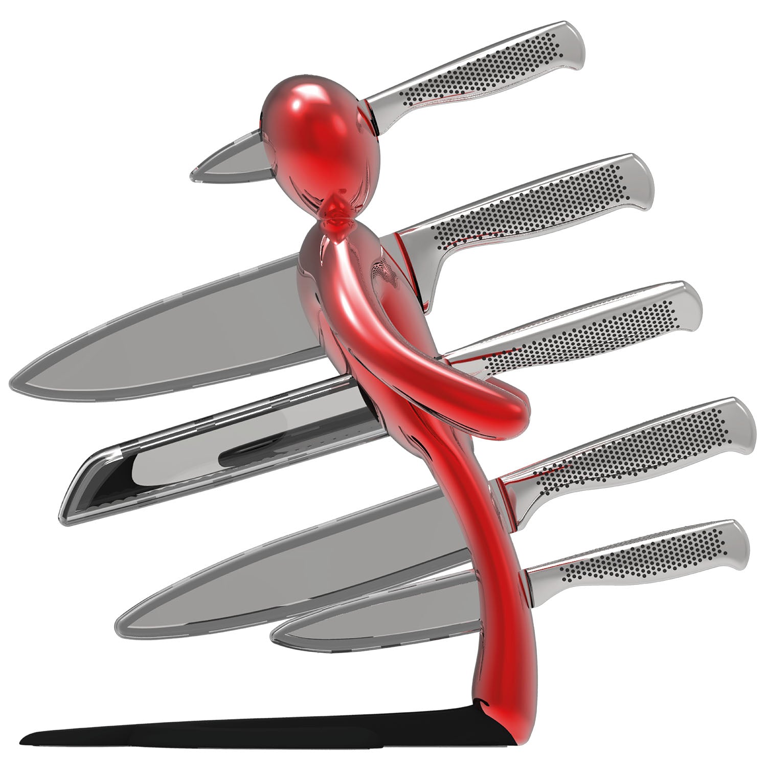 La figura umana stilizzata è colta nell’esatto istante in cui cade all’indietro, trafitta dall’ultima coltellata fatale. I piedi poggiano direttamente sul piano, facendo apparire la figura quasi sospesa a mezz’aria. Realizzato interamente in metallo, il prodotto risulta molto pesante: questo garantisce un’eccellente stabilità e consente l’uso con una sola mano, permettendo di inserire o rimuovere i coltelli senza dover tenere fermo il supporto.