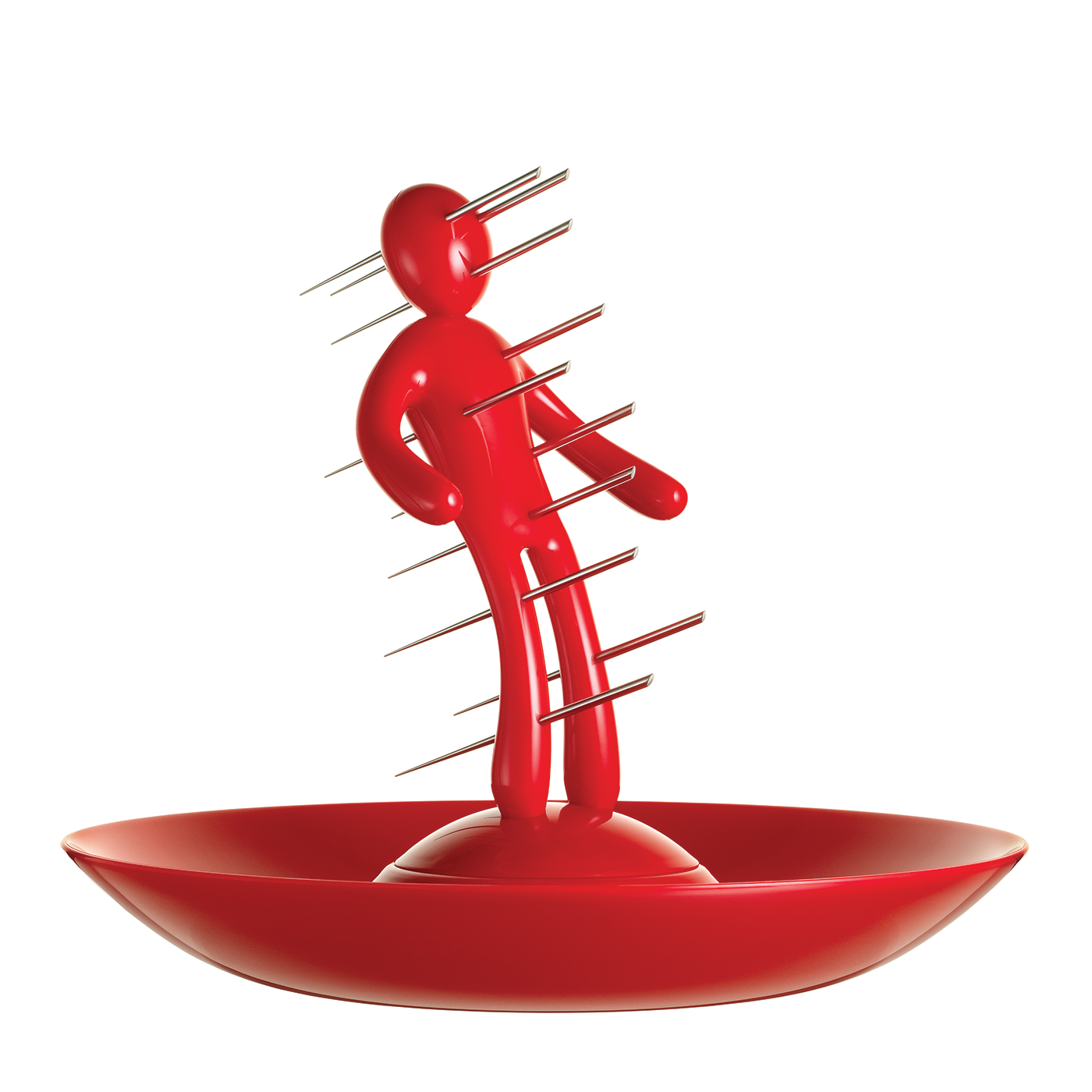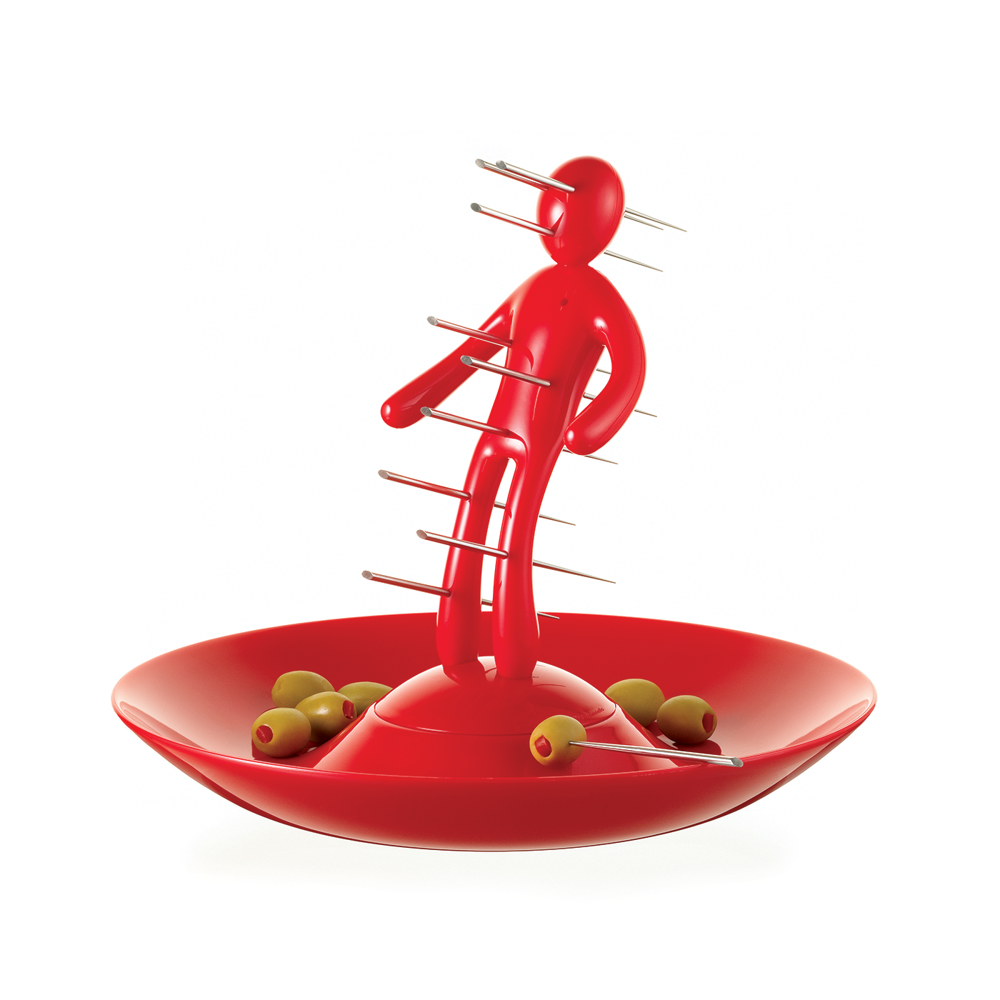 La figura umana stilizzata in questo caso è trafitta da 10 spilloni realizzati in acciaio inox. Questi servono per infilzare i cibi che è possibile disporre sul grande piatto/vassoio che funge anche da base.