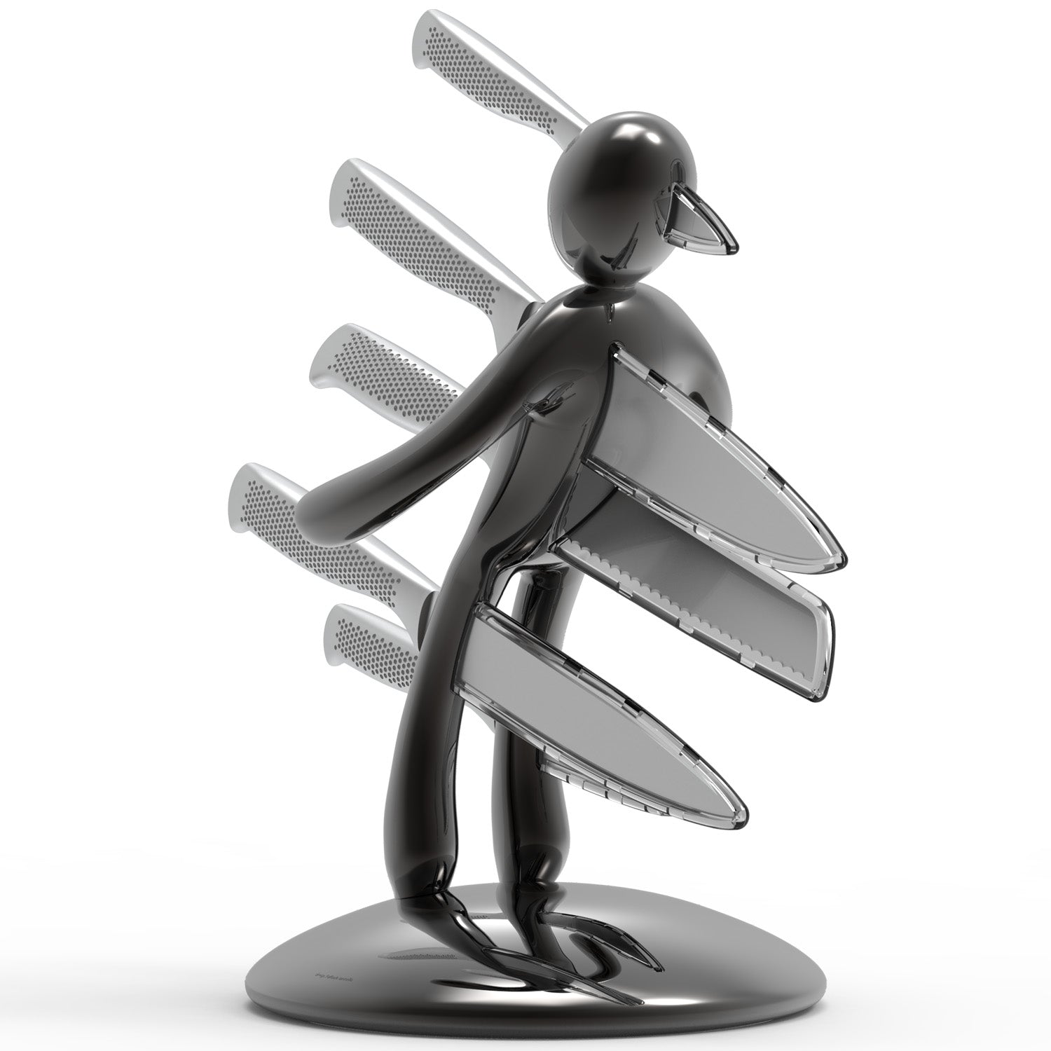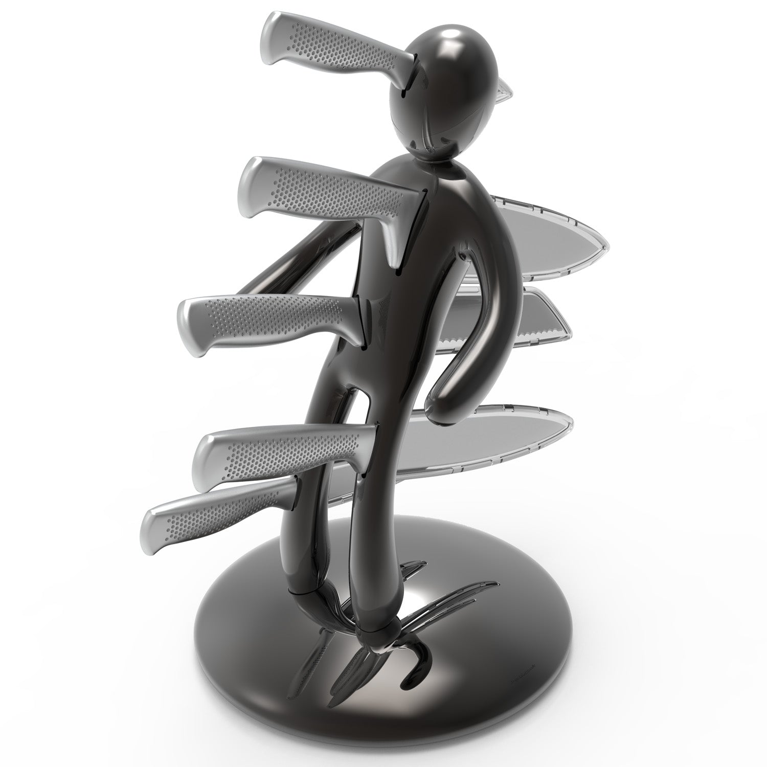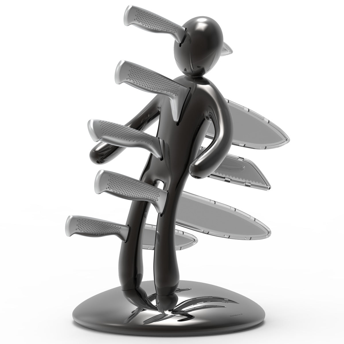 La base mantiene la classica forma circolare e rappresenta simbolicamente una chiazza di sangue che, fluendo lungo il corpo e arrivando fino ai piedi, diventa tridimensionale e funge da supporto per tutto il set. Sebbene la base abbia le stesse dimensioni del modello precedente, ora è decisamente più pesante, per dare maggiore stabilità all’intero blocco e permetterne l’uso con una sola mano: i coltelli possono ora essere inseriti o rimossi senza dover tenere il supporto con l'altra mano.