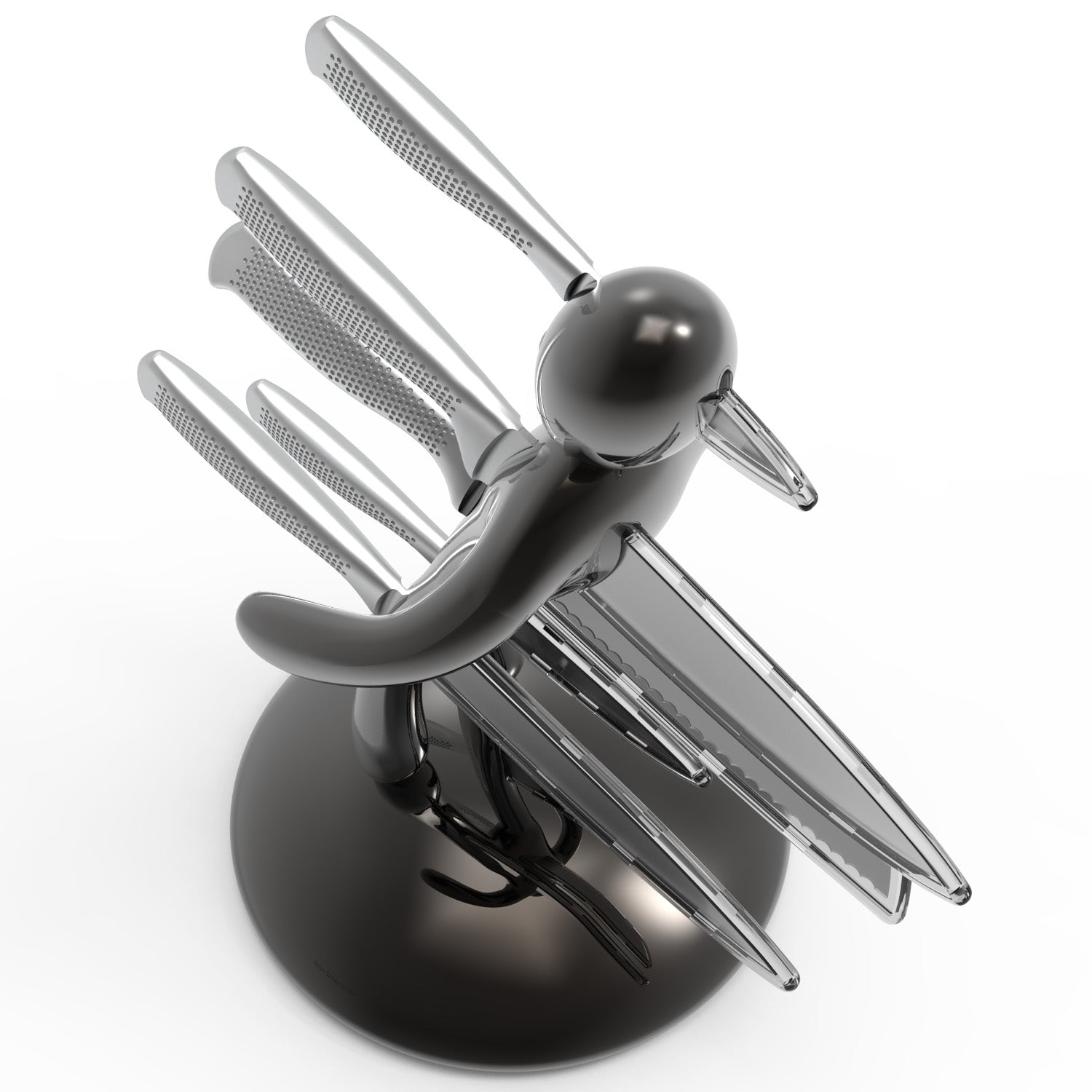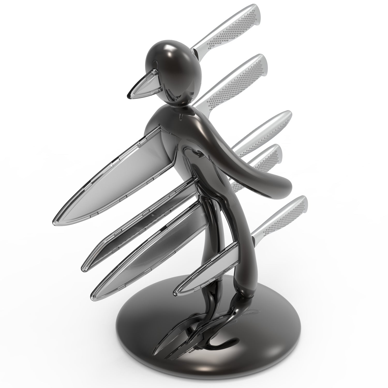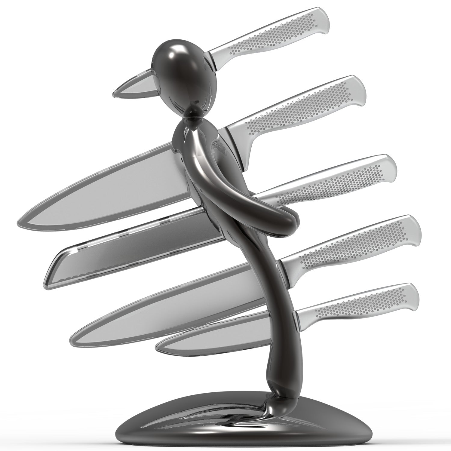 La base mantiene la classica forma circolare e rappresenta simbolicamente una chiazza di sangue che, fluendo lungo il corpo e arrivando fino ai piedi, diventa tridimensionale e funge da supporto per tutto il set. Sebbene la base abbia le stesse dimensioni del modello precedente, ora è decisamente più pesante, per dare maggiore stabilità all’intero blocco e permetterne l’uso con una sola mano: i coltelli possono ora essere inseriti o rimossi senza dover tenere il supporto con l'altra mano.