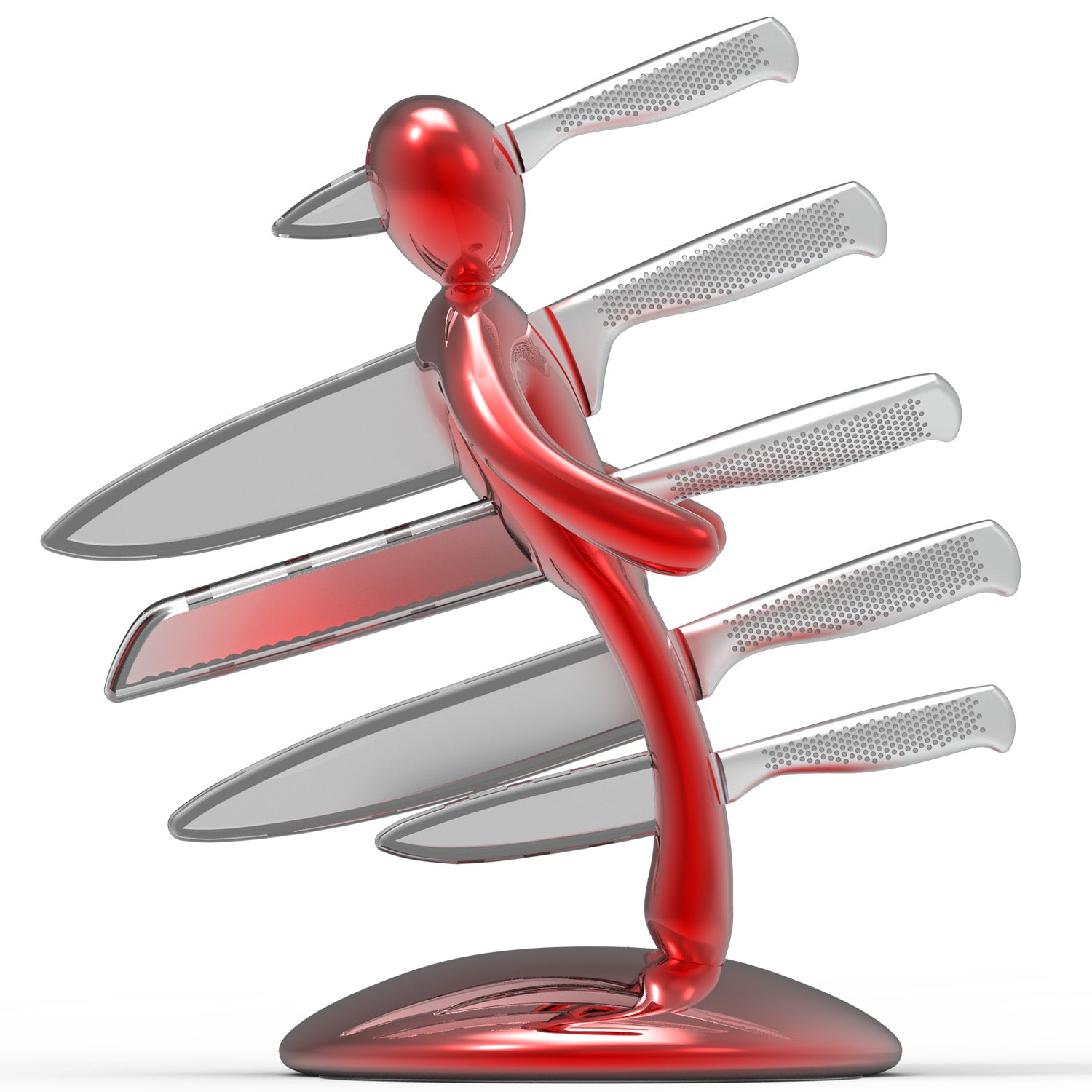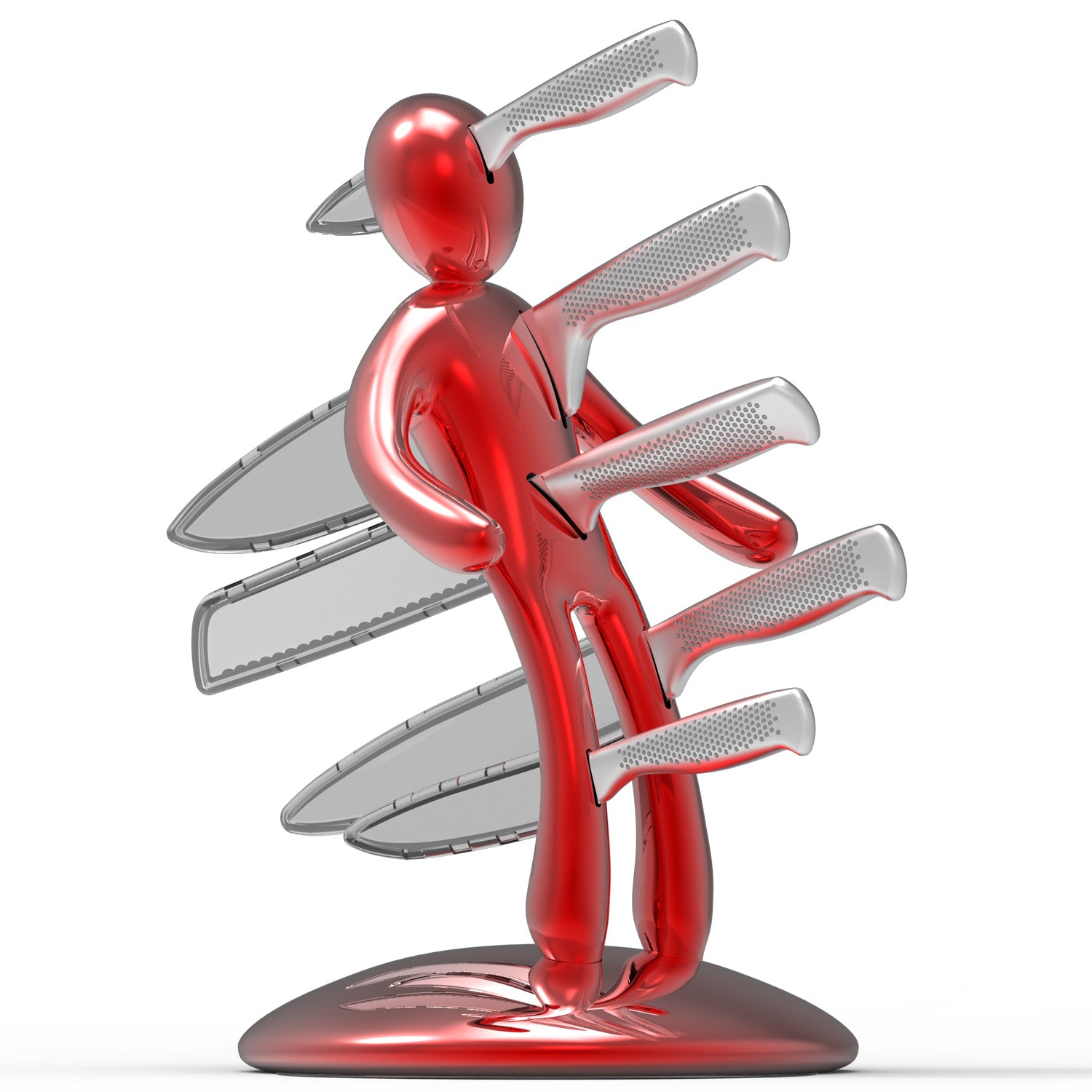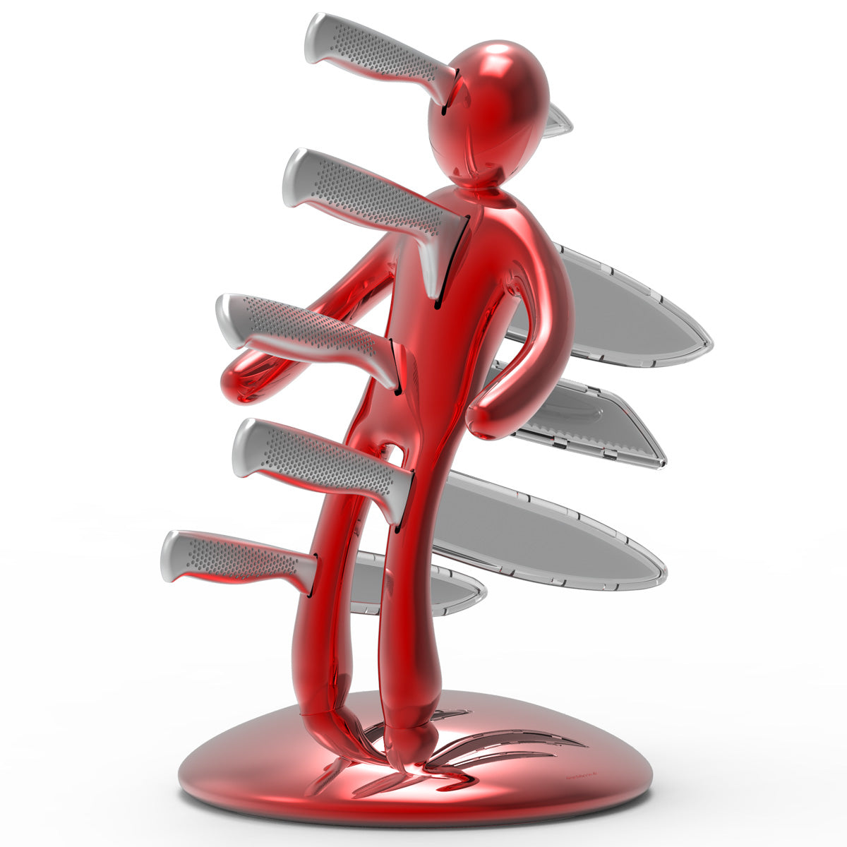 La base mantiene la classica forma circolare e rappresenta simbolicamente una chiazza di sangue che, fluendo lungo il corpo e arrivando fino ai piedi, diventa tridimensionale e funge da supporto per tutto il set. Sebbene la base abbia le stesse dimensioni del modello precedente, ora è decisamente più pesante, per dare maggiore stabilità all’intero blocco e permetterne l’uso con una sola mano: i coltelli possono ora essere inseriti o rimossi senza dover tenere il supporto con l'altra mano.