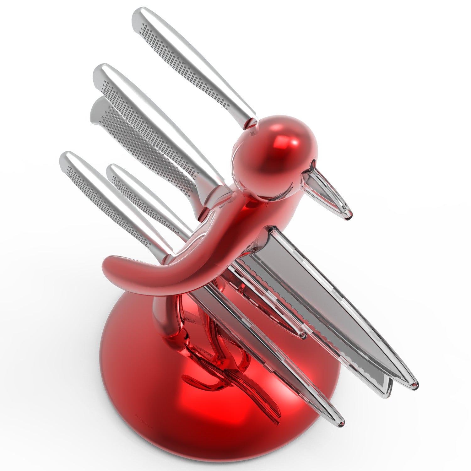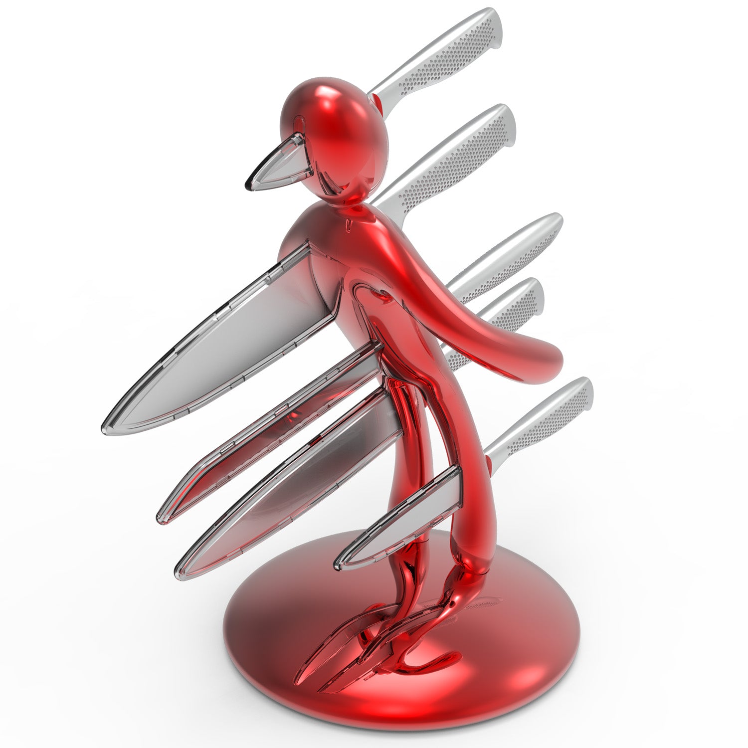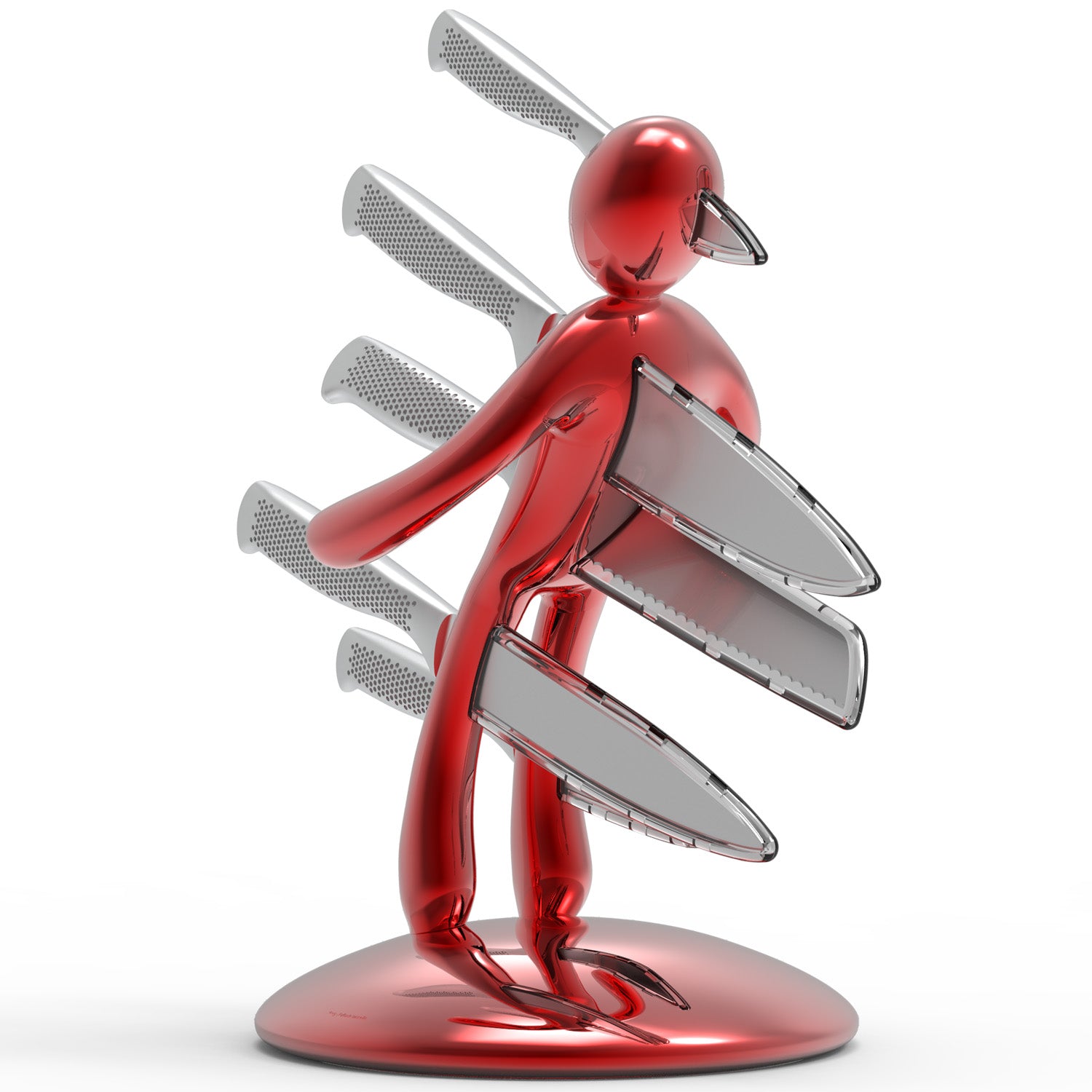 La base mantiene la classica forma circolare e rappresenta simbolicamente una chiazza di sangue che, fluendo lungo il corpo e arrivando fino ai piedi, diventa tridimensionale e funge da supporto per tutto il set. Sebbene la base abbia le stesse dimensioni del modello precedente, ora è decisamente più pesante, per dare maggiore stabilità all’intero blocco e permetterne l’uso con una sola mano: i coltelli possono ora essere inseriti o rimossi senza dover tenere il supporto con l'altra mano.