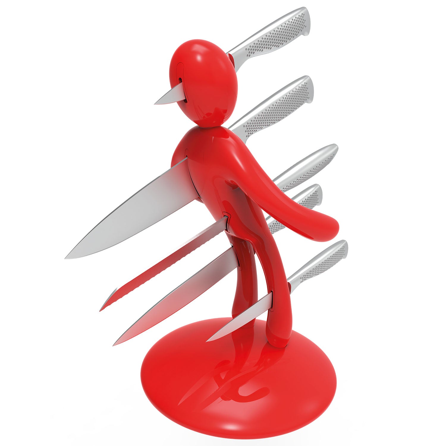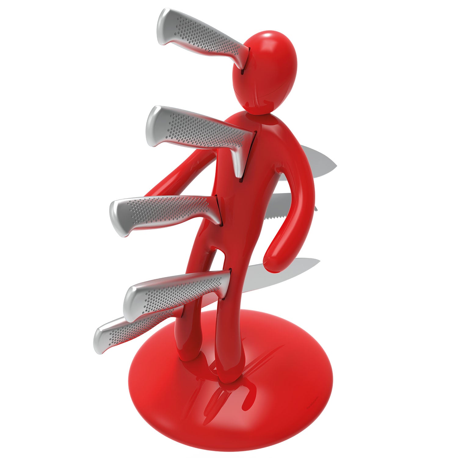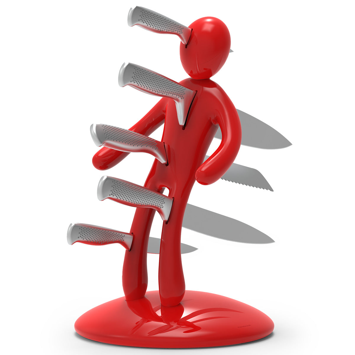 La base mantiene la classica forma circolare e rappresenta simbolicamente una chiazza di sangue che, fluendo lungo il corpo e arrivando fino ai piedi, diventa tridimensionale e funge da supporto per tutto il set. Sebbene la base abbia le stesse dimensioni del modello precedente, ora è decisamente più pesante, per dare maggiore stabilità all’intero blocco e permetterne l’uso con una sola mano: i coltelli possono ora essere inseriti o rimossi senza dover tenere il supporto con l'altra mano.