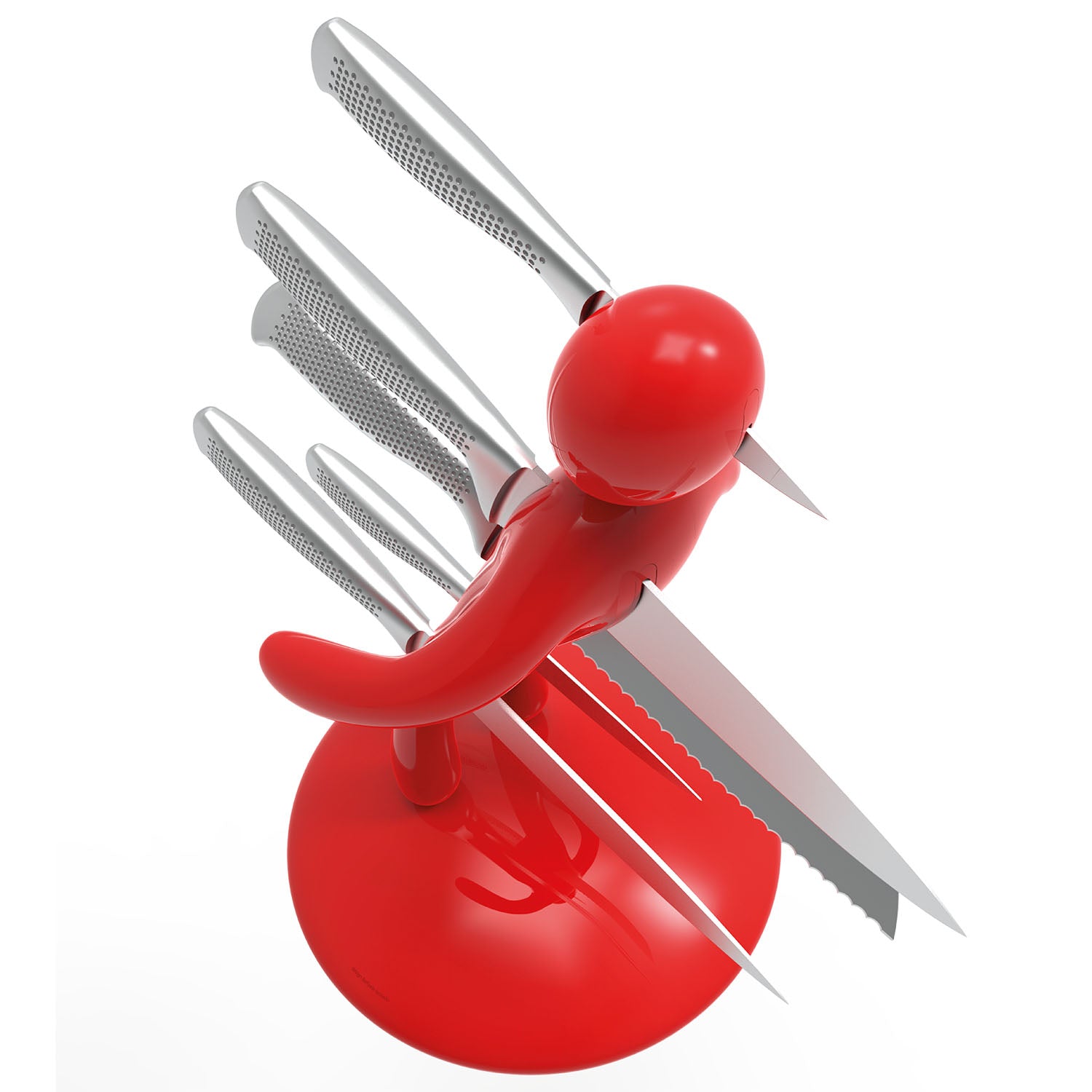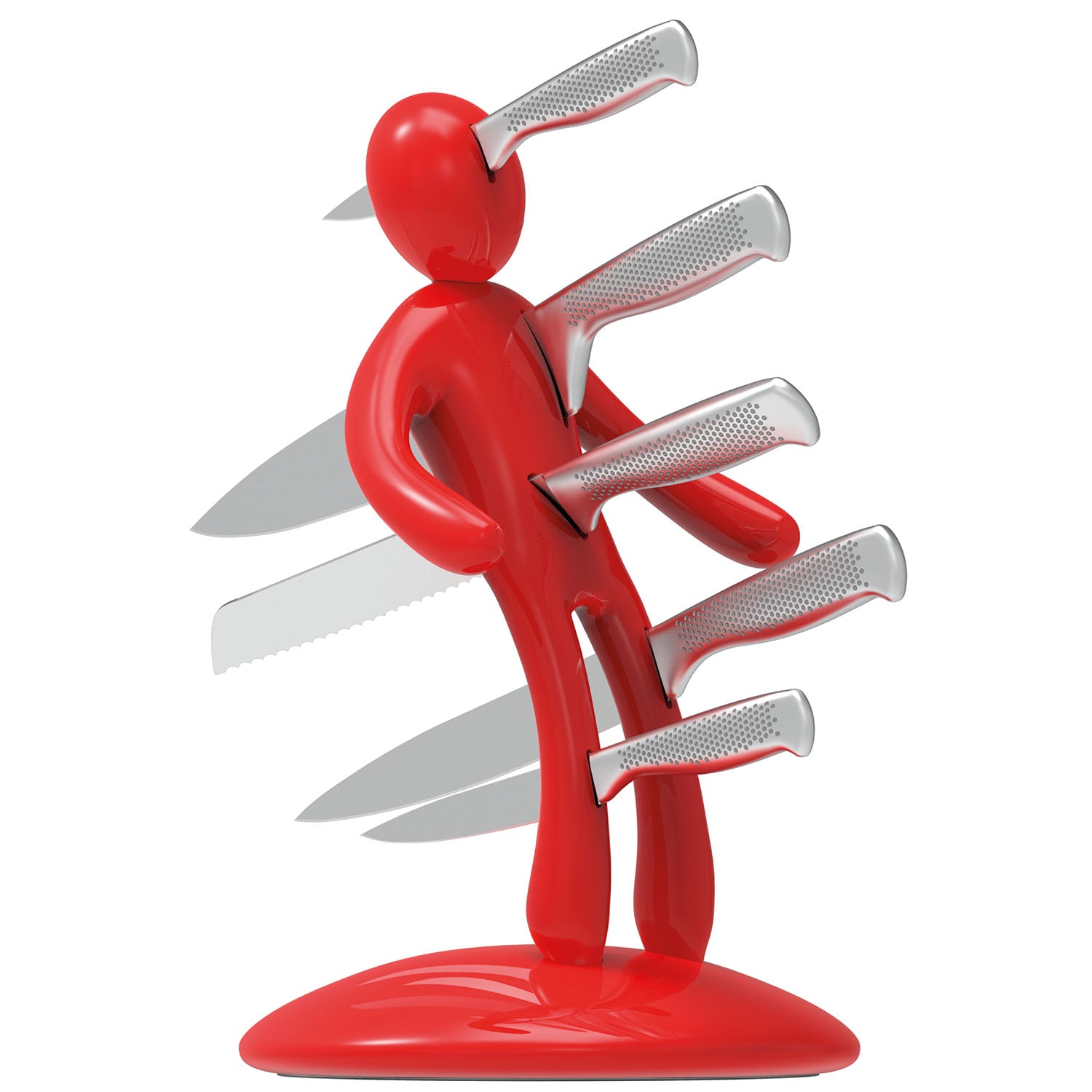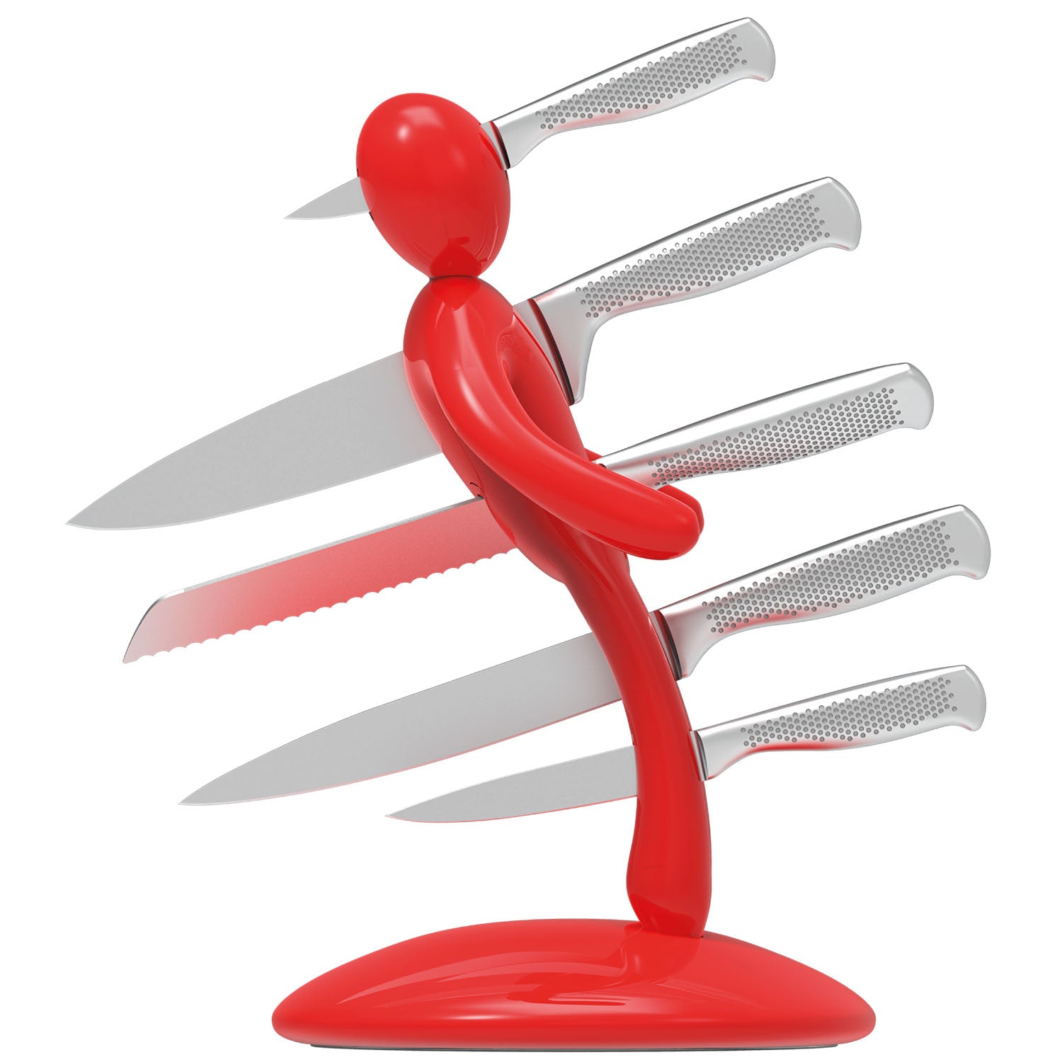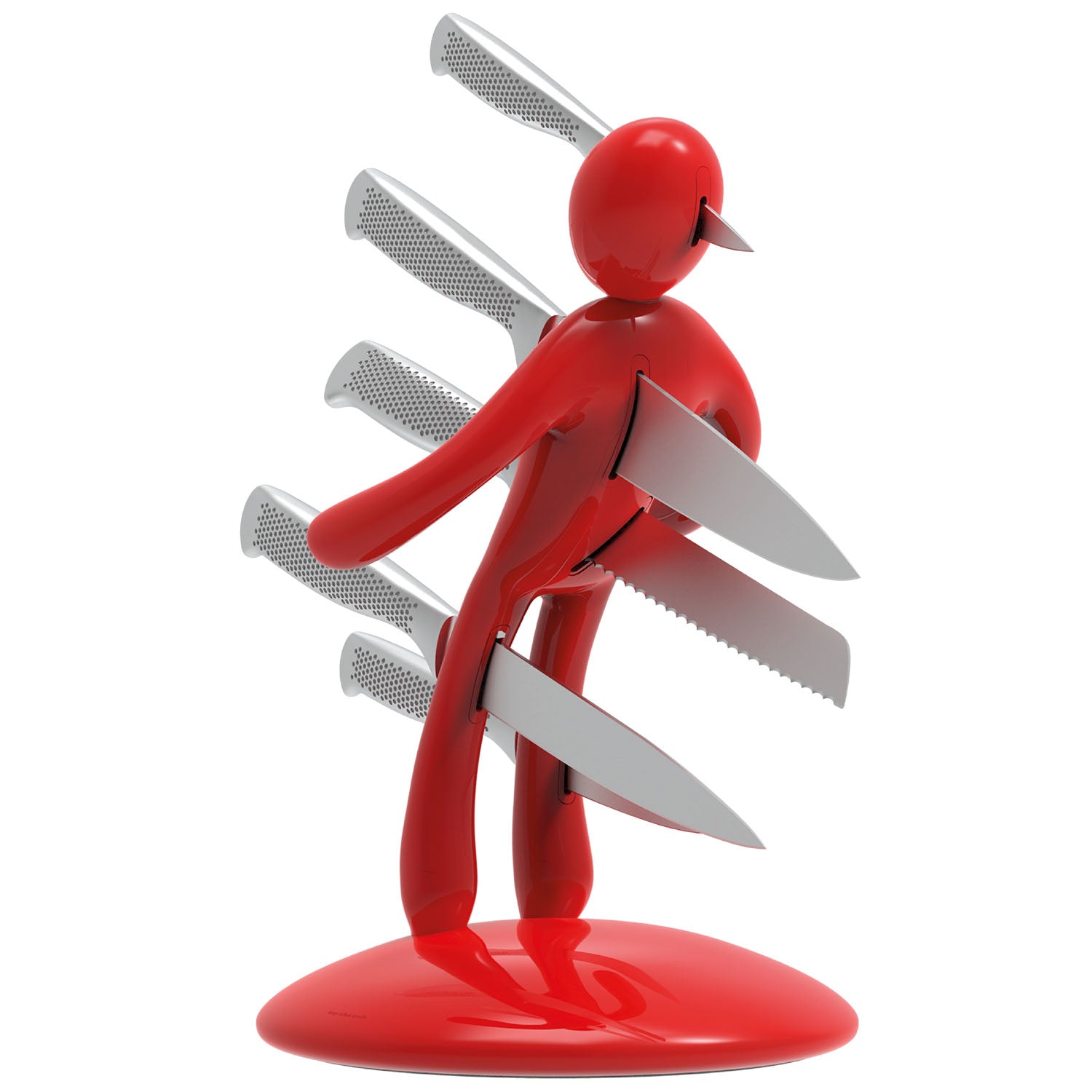 La base mantiene la classica forma circolare e rappresenta simbolicamente una chiazza di sangue che, fluendo lungo il corpo e arrivando fino ai piedi, diventa tridimensionale e funge da supporto per tutto il set. Sebbene la base abbia le stesse dimensioni del modello precedente, ora è decisamente più pesante, per dare maggiore stabilità all’intero blocco e permetterne l’uso con una sola mano: i coltelli possono ora essere inseriti o rimossi senza dover tenere il supporto con l'altra mano.