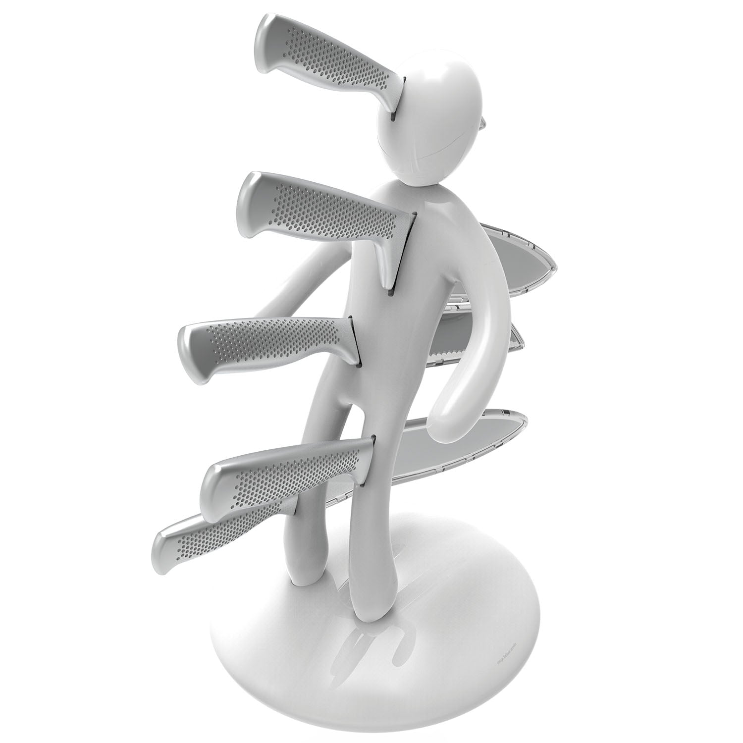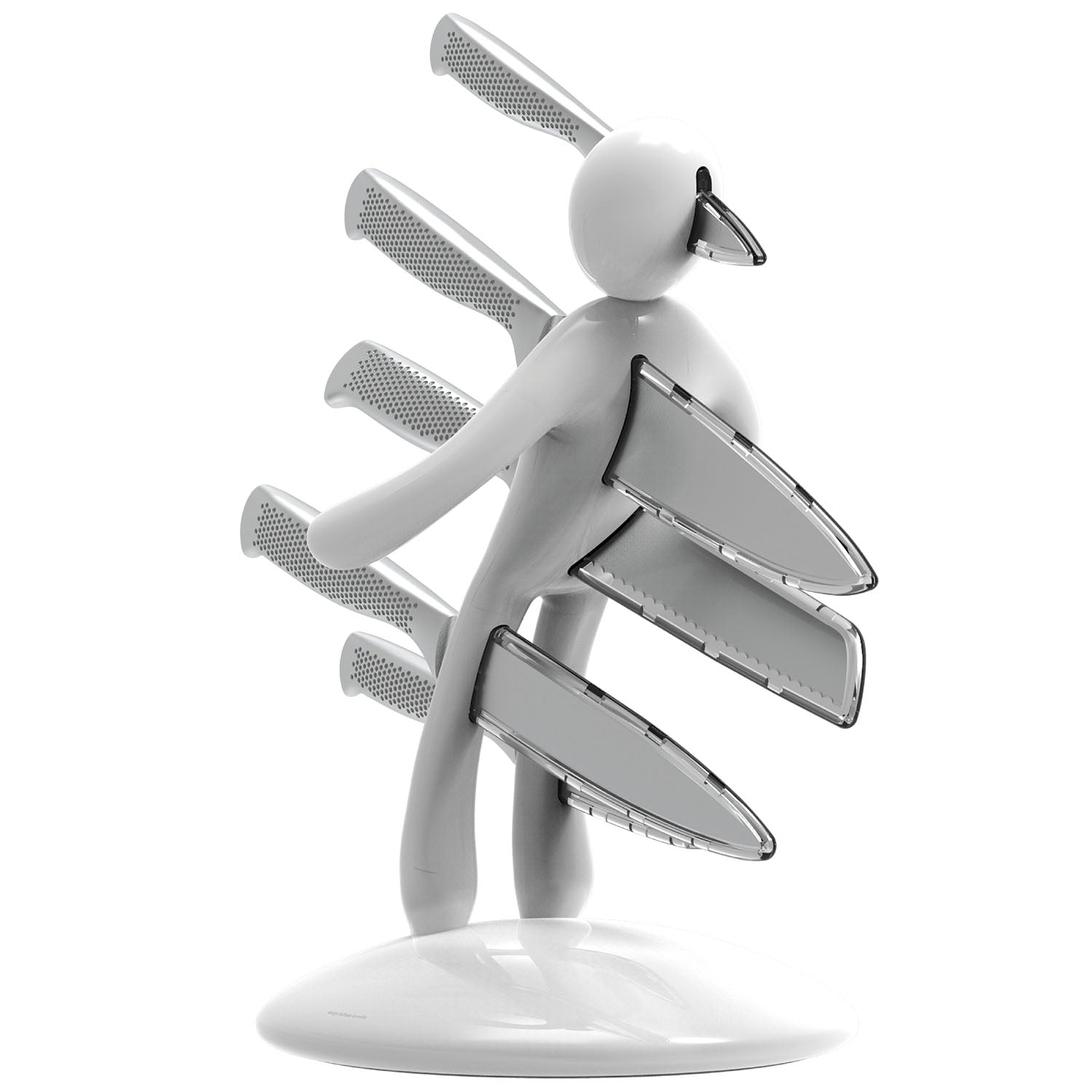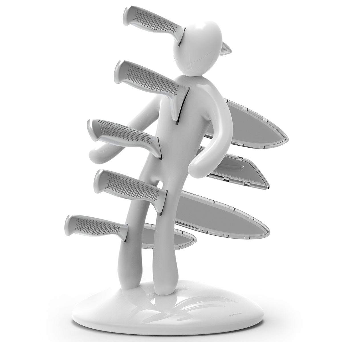 La base mantiene la classica forma circolare e rappresenta simbolicamente una chiazza di sangue che, fluendo lungo il corpo e arrivando fino ai piedi, diventa tridimensionale e funge da supporto per tutto il set. Sebbene la base abbia le stesse dimensioni del modello precedente, ora è decisamente più pesante, per dare maggiore stabilità all’intero blocco e permetterne l’uso con una sola mano: i coltelli possono ora essere inseriti o rimossi senza dover tenere il supporto con l'altra mano.
